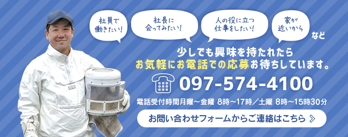 | 応募方法 | 電話でのエントリー 097-574-4100 お問い合わせフォーム |