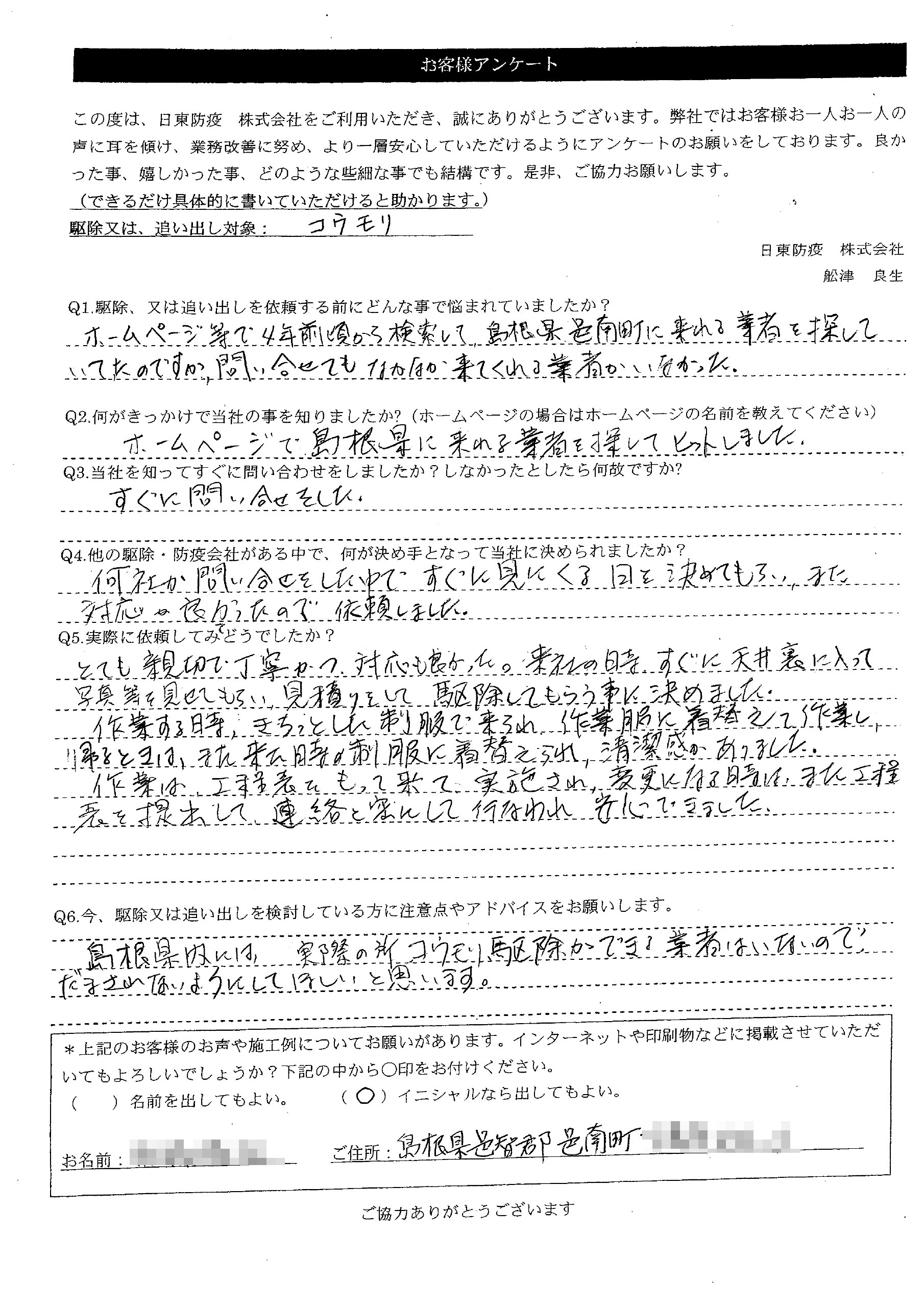 | 島根県内には、実際の所コウモリ駆除ができる業者はいないので、騙されないようにしてほしいと思います | |