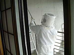 | 施工内容 | 専用の防護服を着用し、機材を用いてハチの営巣 (軒下・樹木・床下等)に接近し、ハチを死滅させつつ営巣の撤去作業を行います。付近に学校や保育施設、通学路がある場合や、建物が密集している場合は予め注意を促して施工します。 |