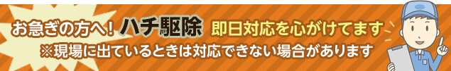 | 施工金額 | スズメバチ(19,800円(税込)より。実際金額は現地見積りを事前に行います。) アシナガバチ(7,700円(税込)より。実際金額は現地見積りを事前に行います。) ミツバチ(14,300円(税込)より。実際金額は現地見積りを事前に行います。) |
