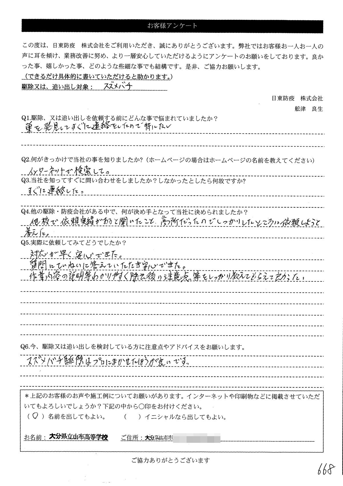 大分県立由布高等学校様アンケート Q1.駆除又は、追い出しを依頼する前にどんな事で悩まれていましたか?