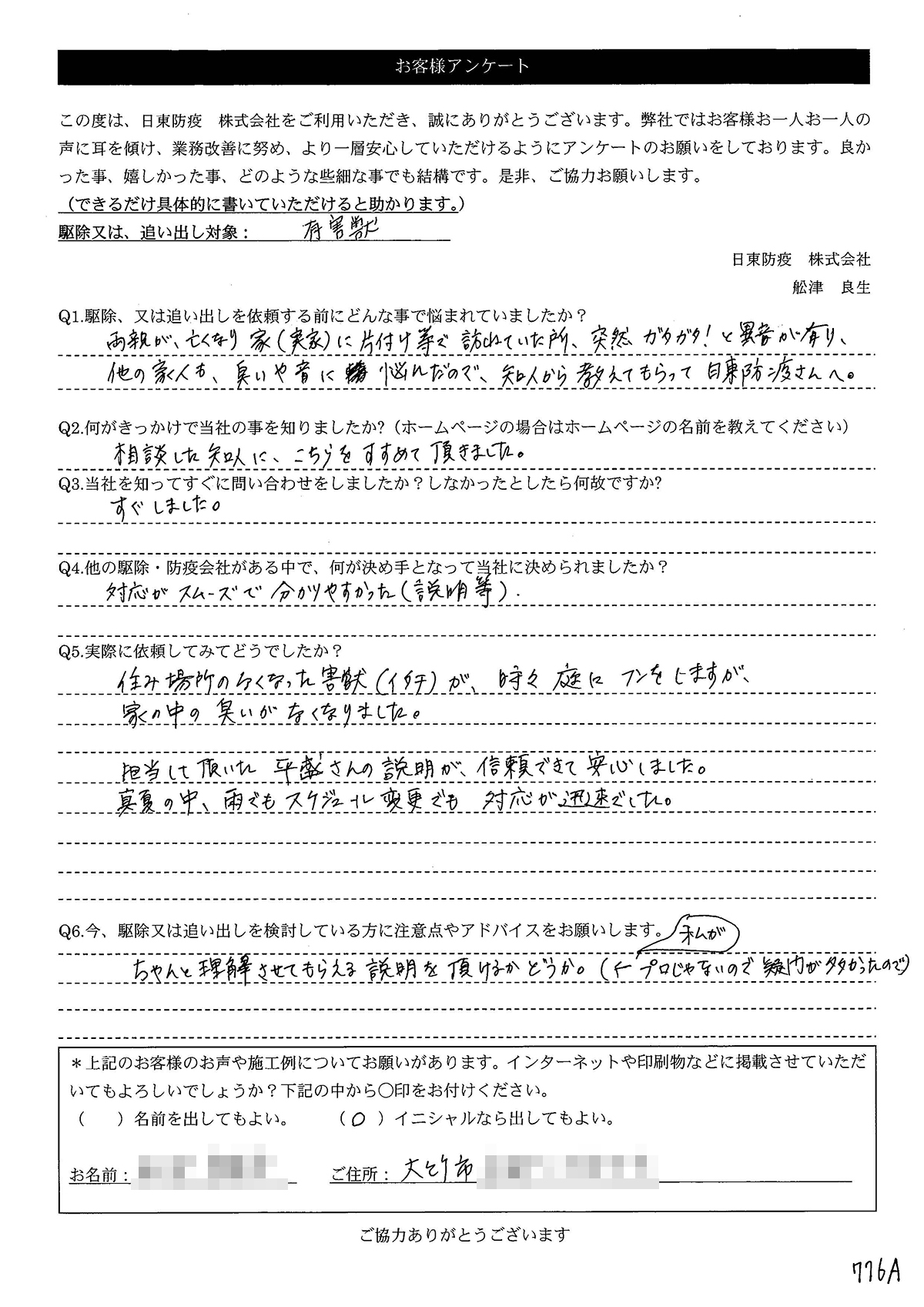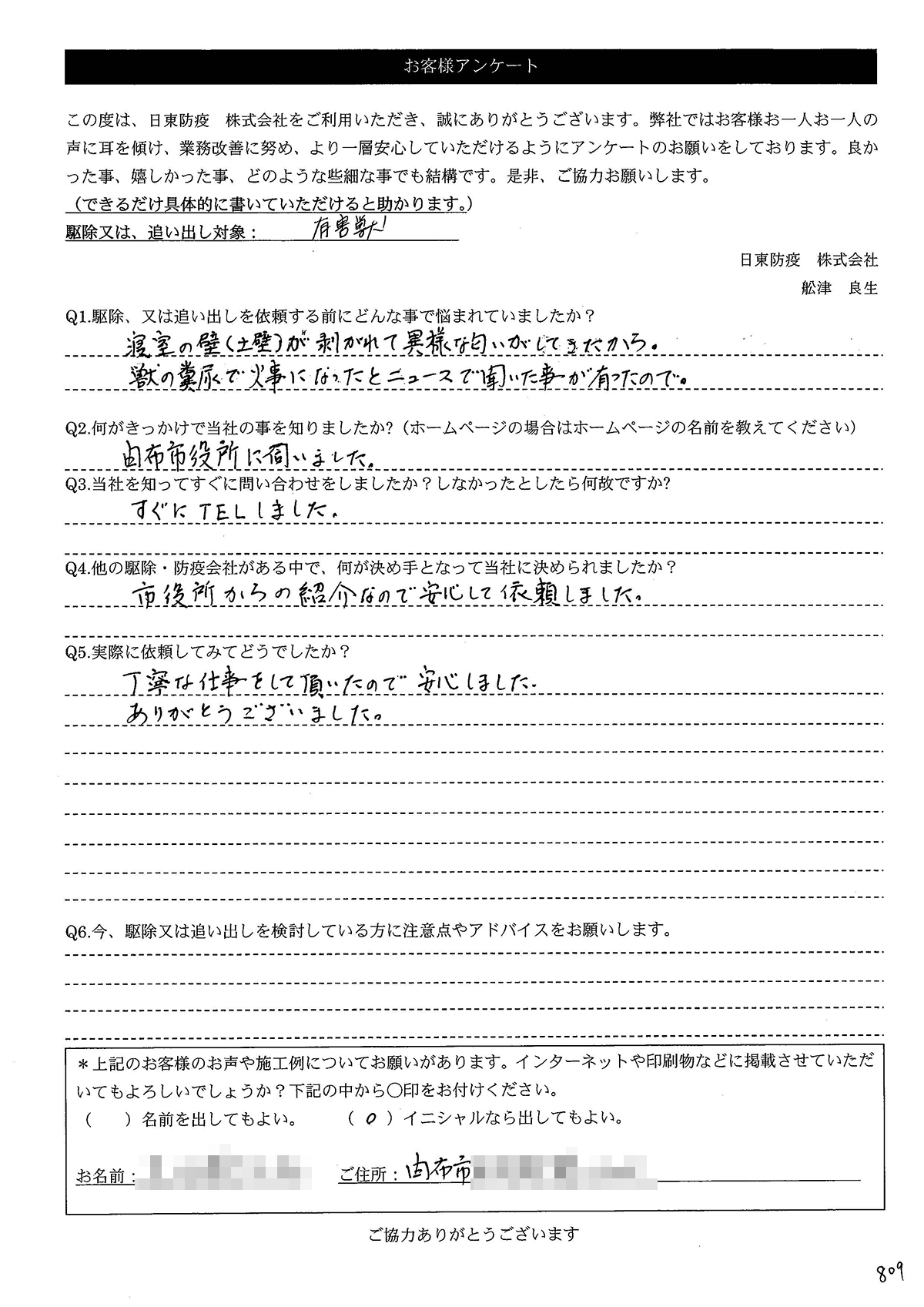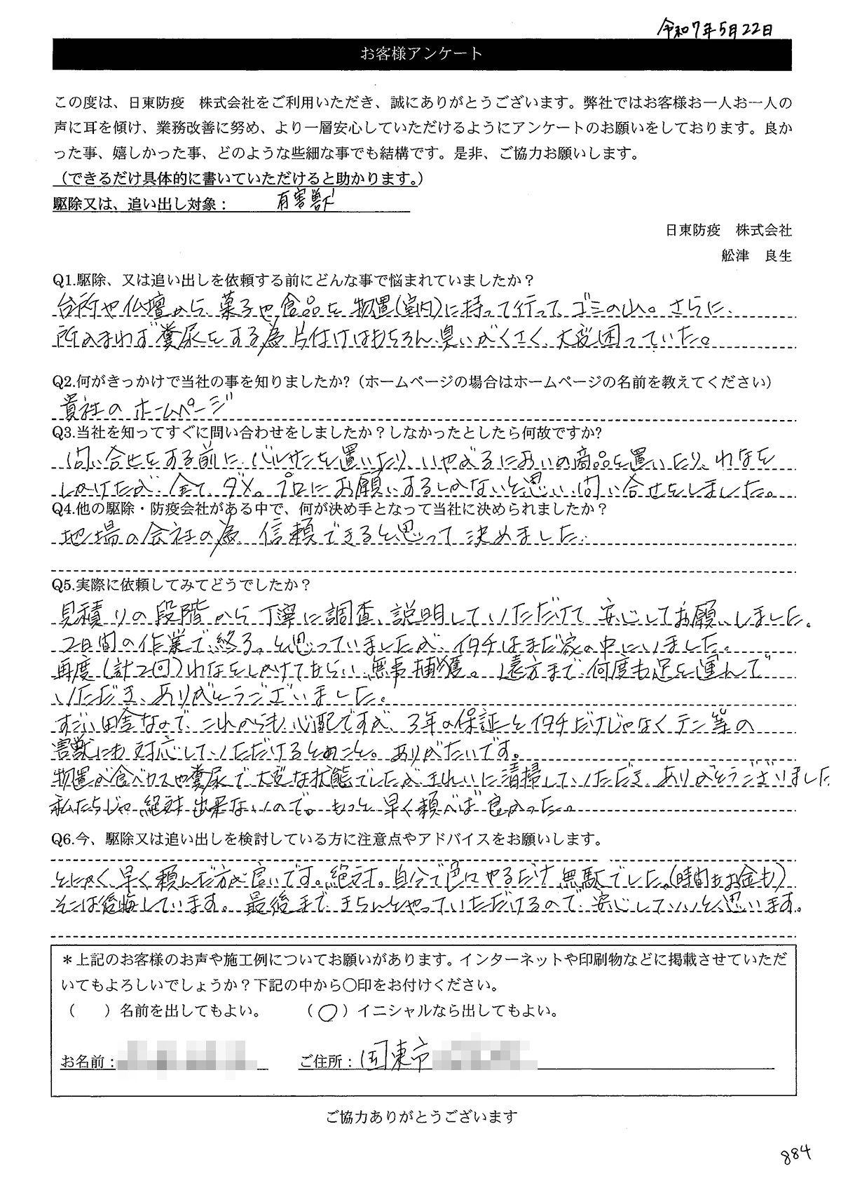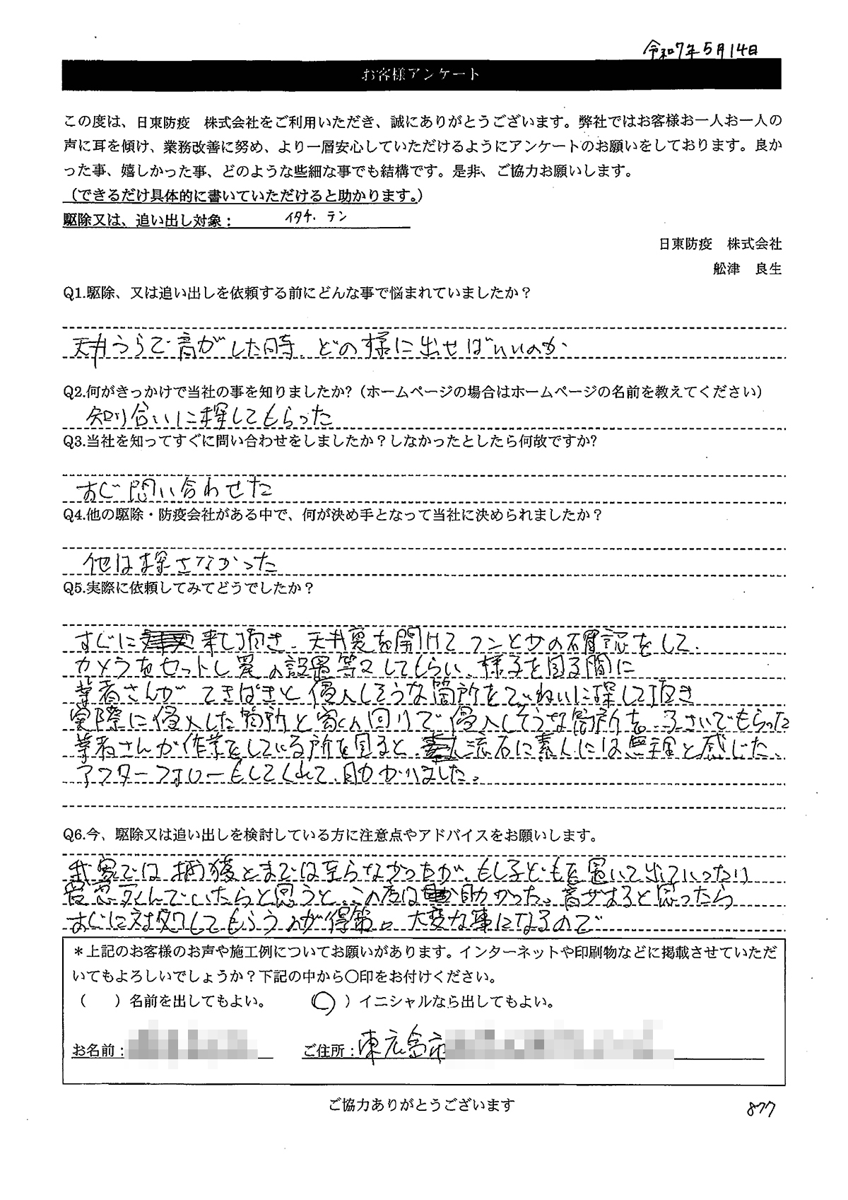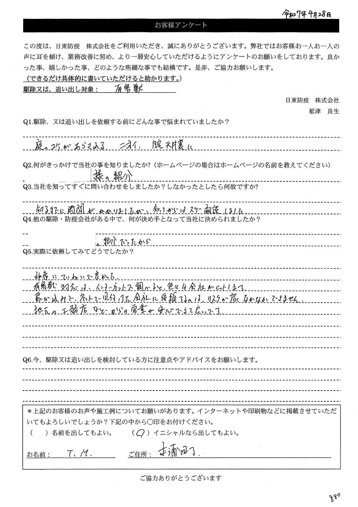 こういった駆除等をお願いするのが初めてだったので、信頼できる御社に依頼して本当に良かったと思っています。
