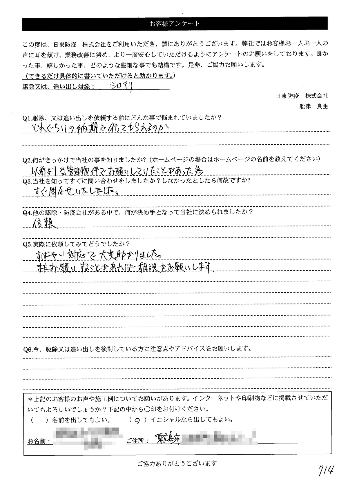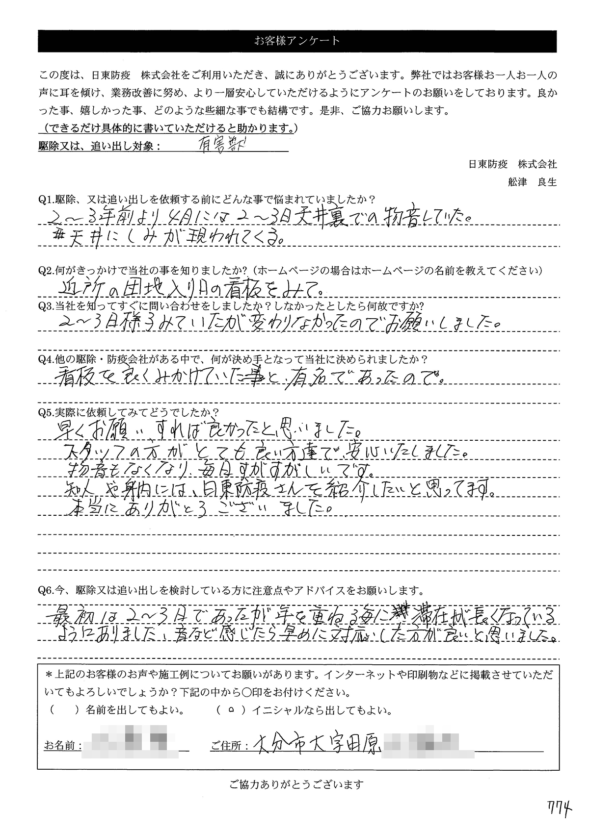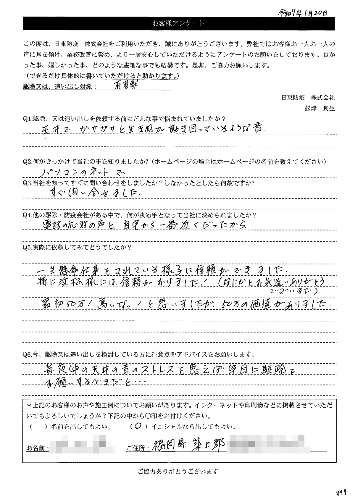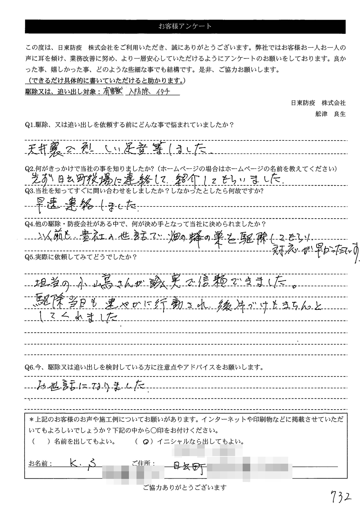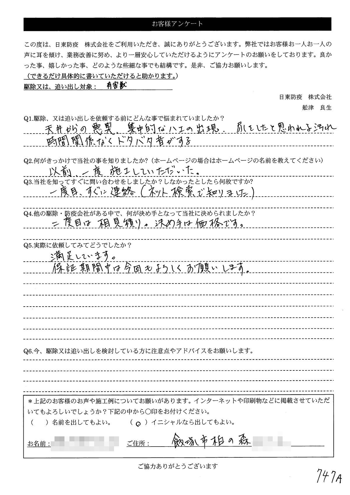 こういった駆除等をお願いするのが初めてだったので、信頼できる御社に依頼して本当に良かったと思っています。