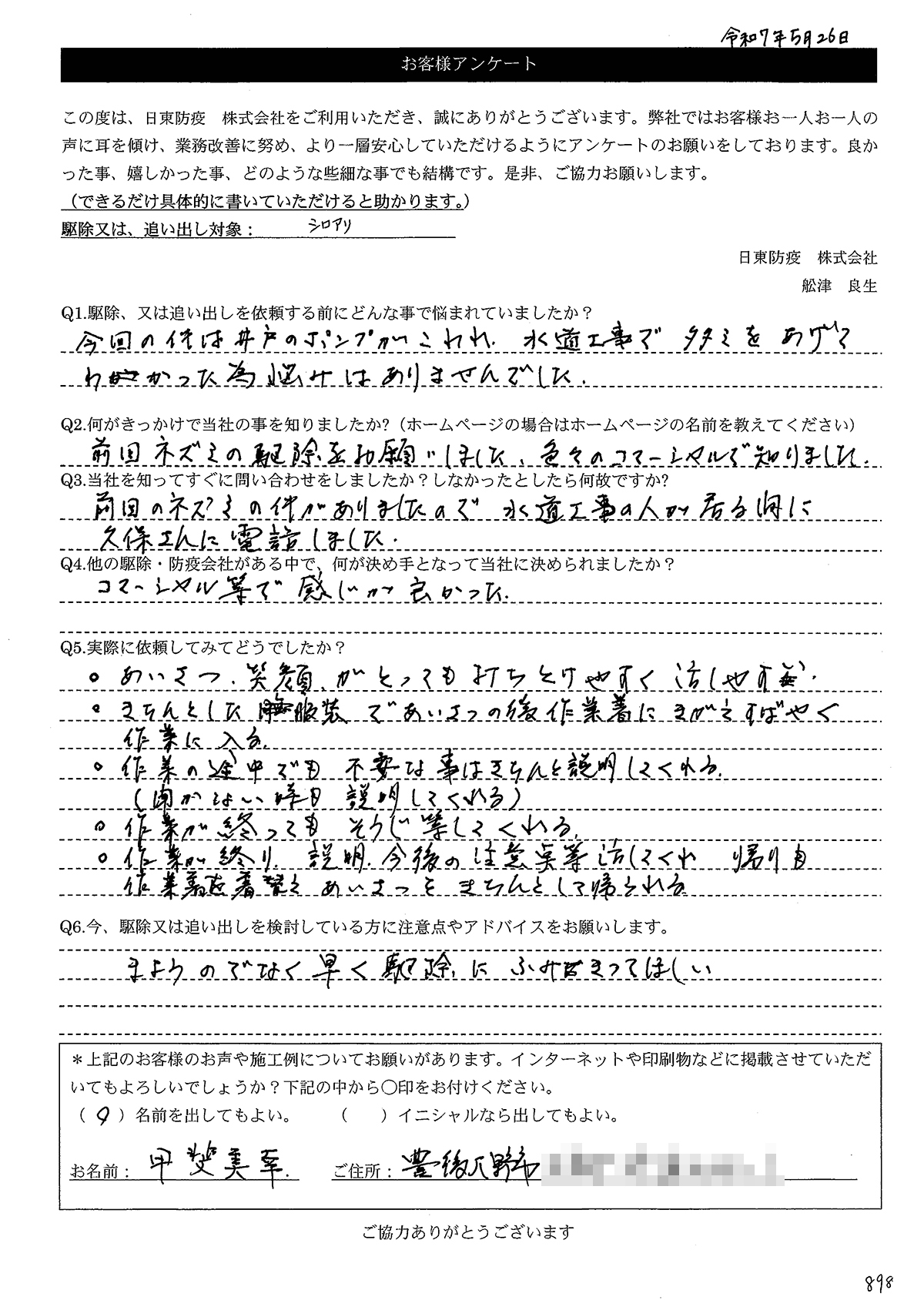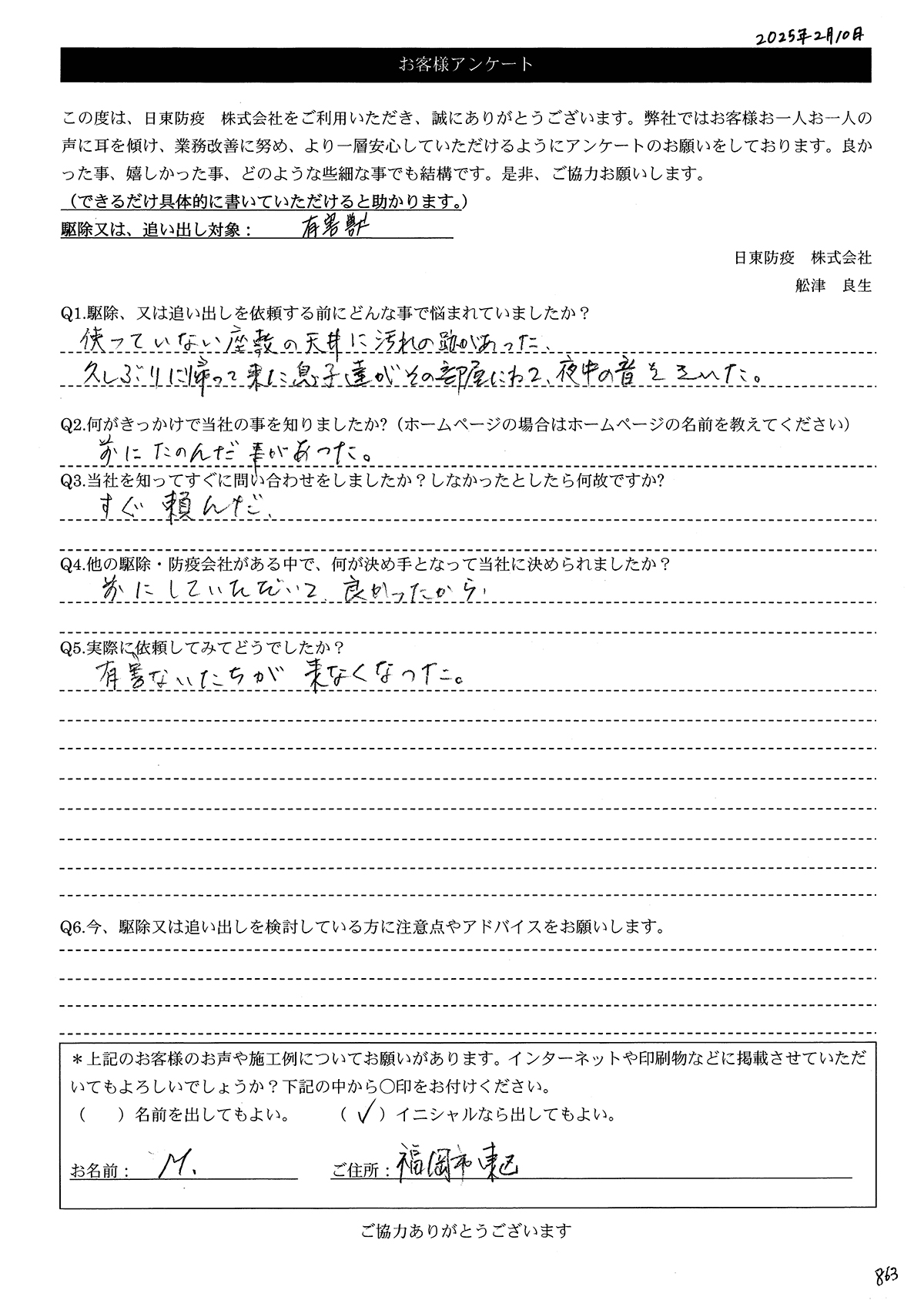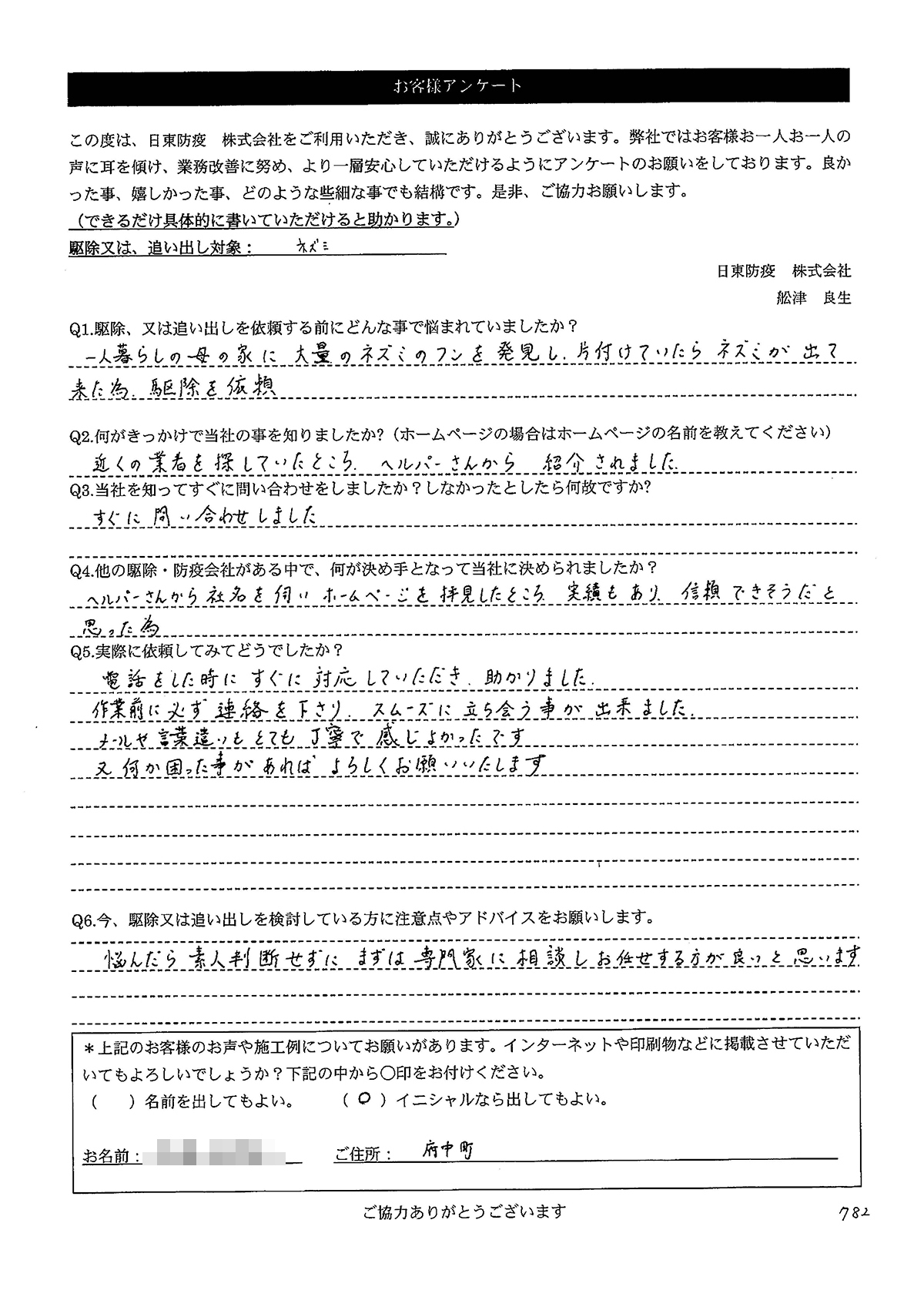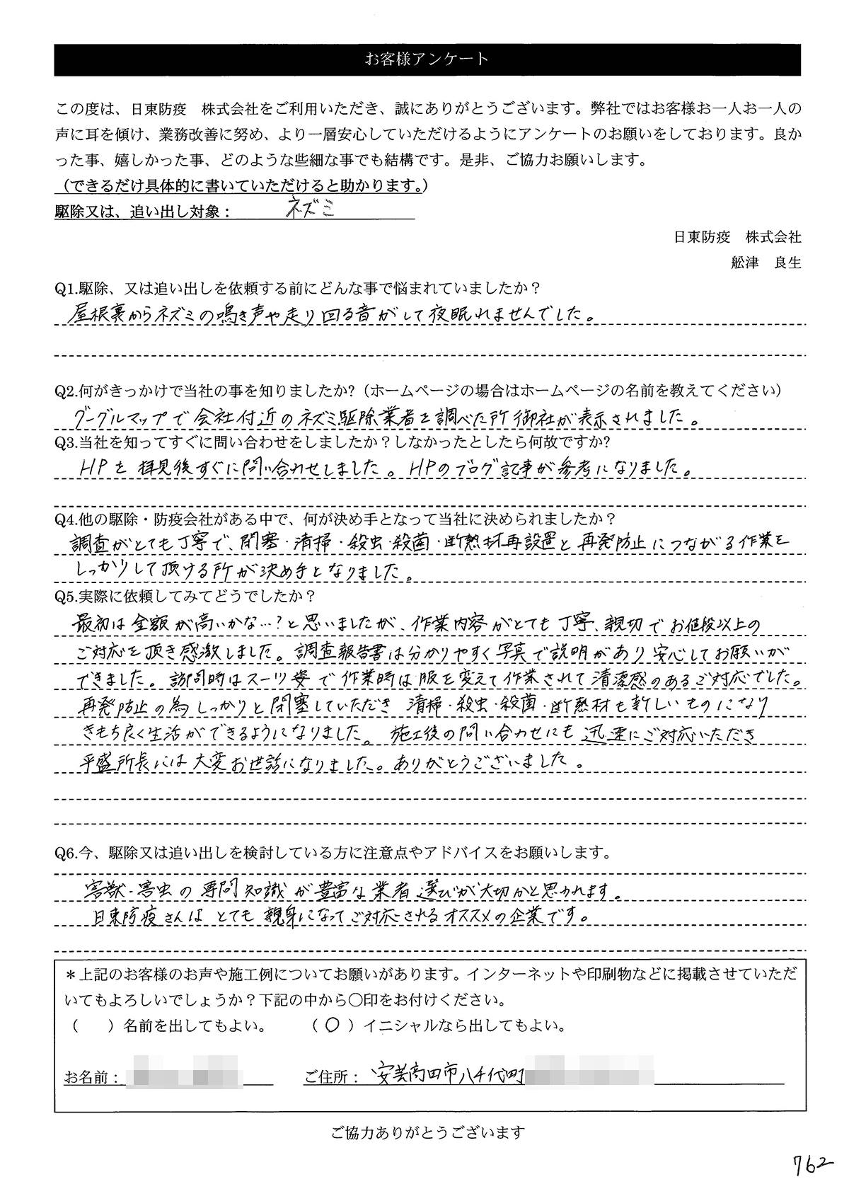 こういった駆除等をお願いするのが初めてだったので、信頼できる御社に依頼して本当に良かったと思っています。