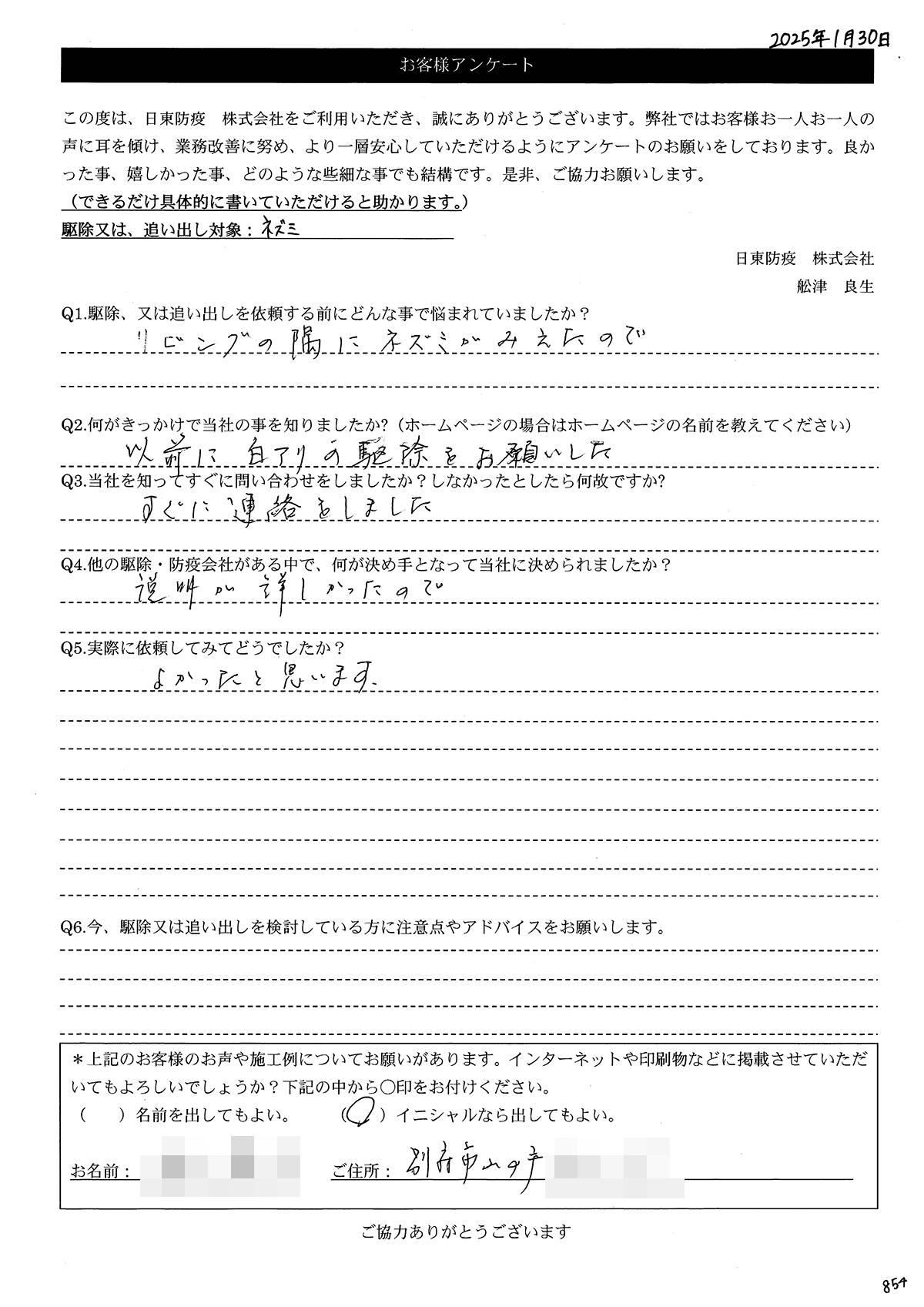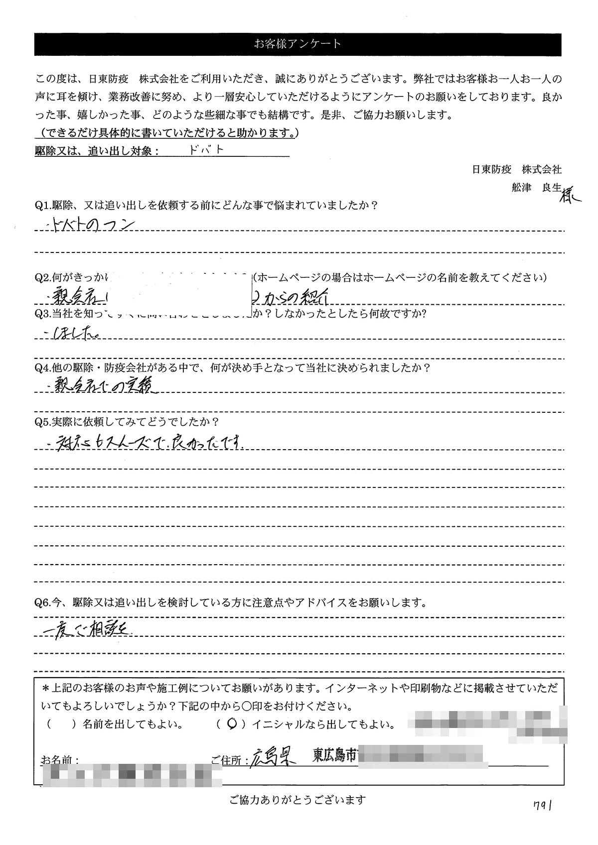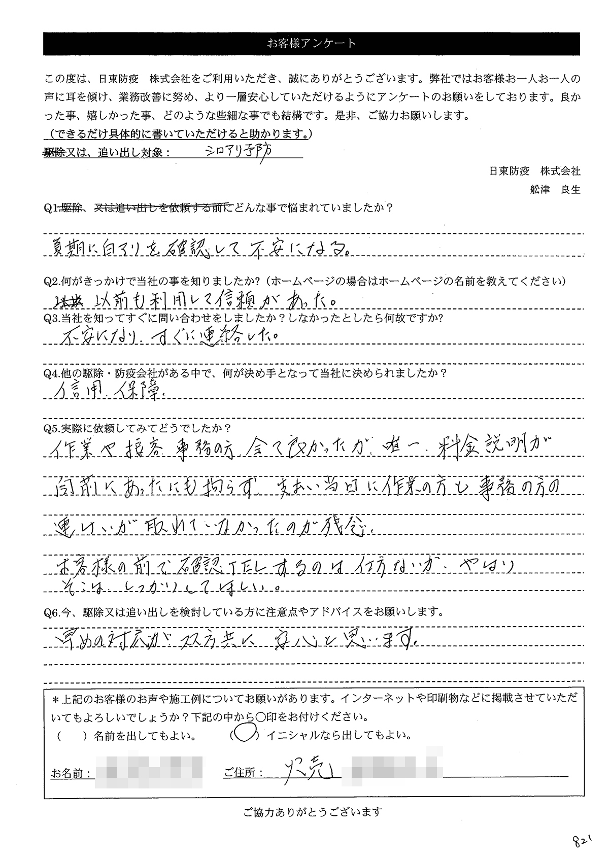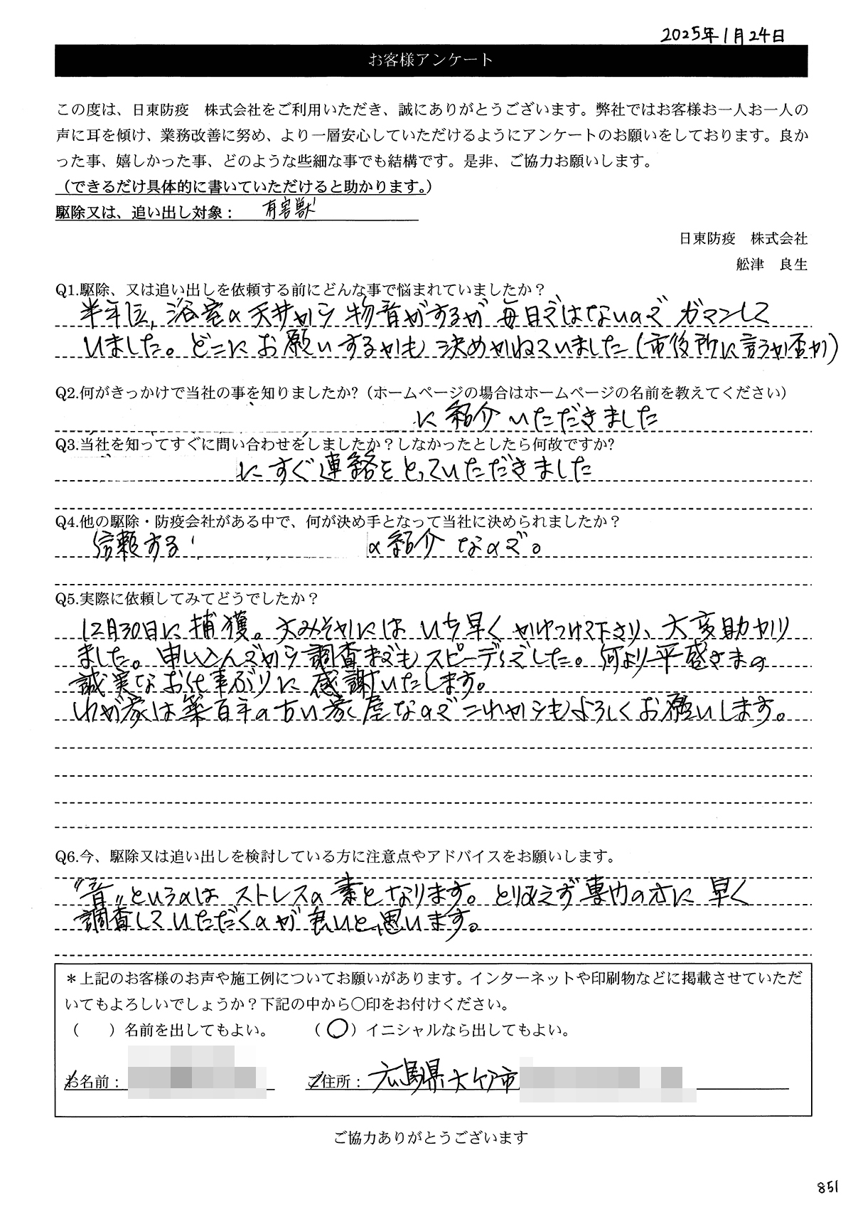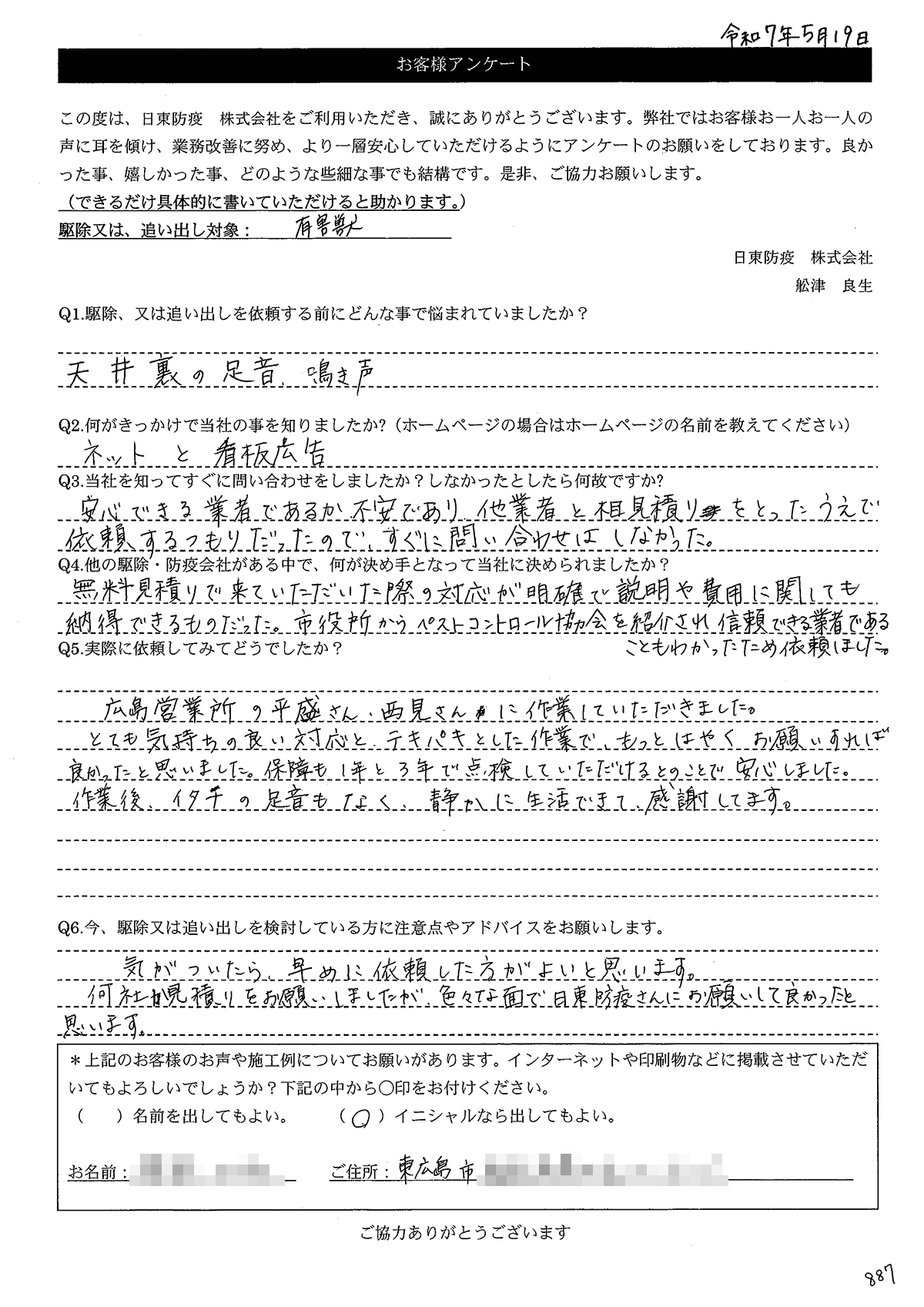 こういった駆除等をお願いするのが初めてだったので、信頼できる御社に依頼して本当に良かったと思っています。