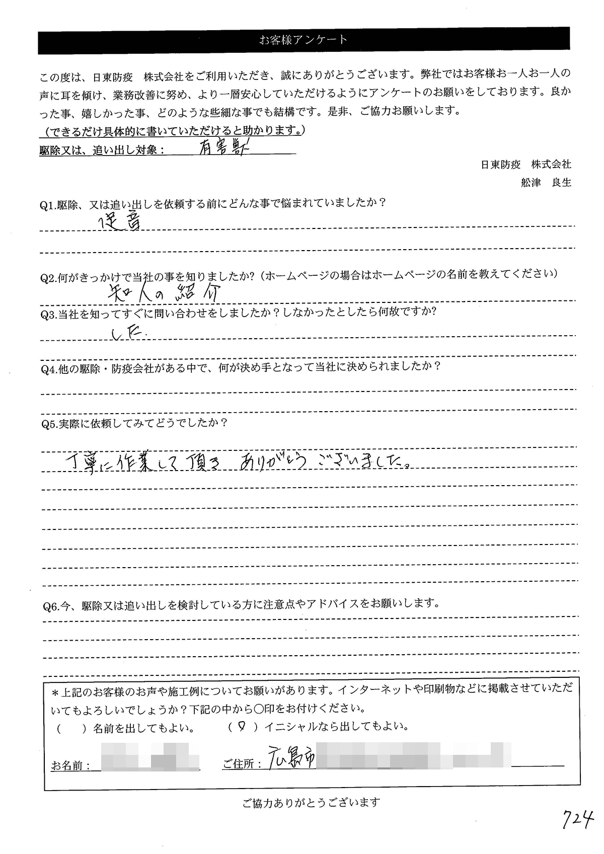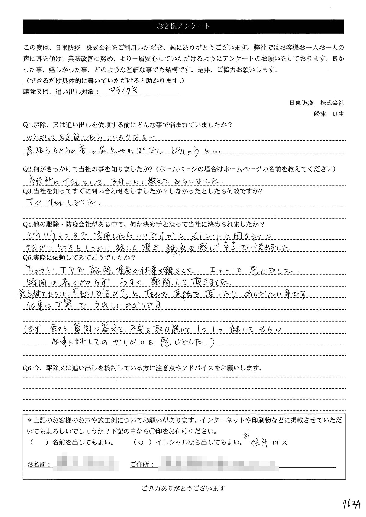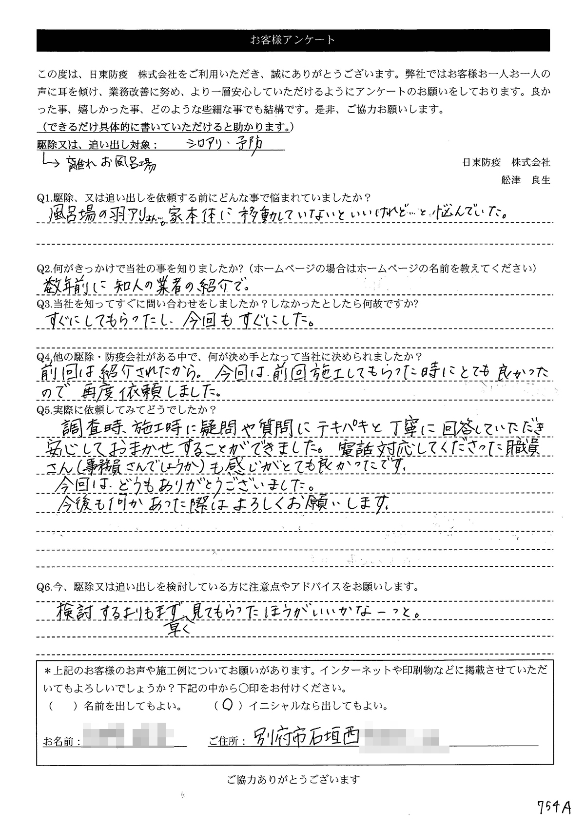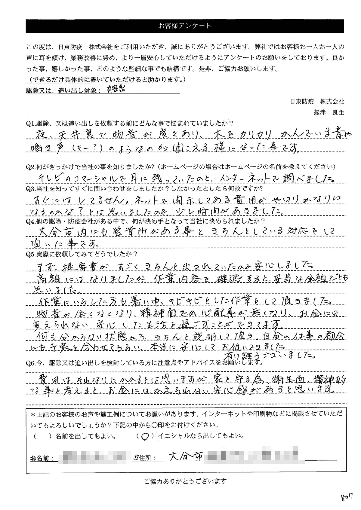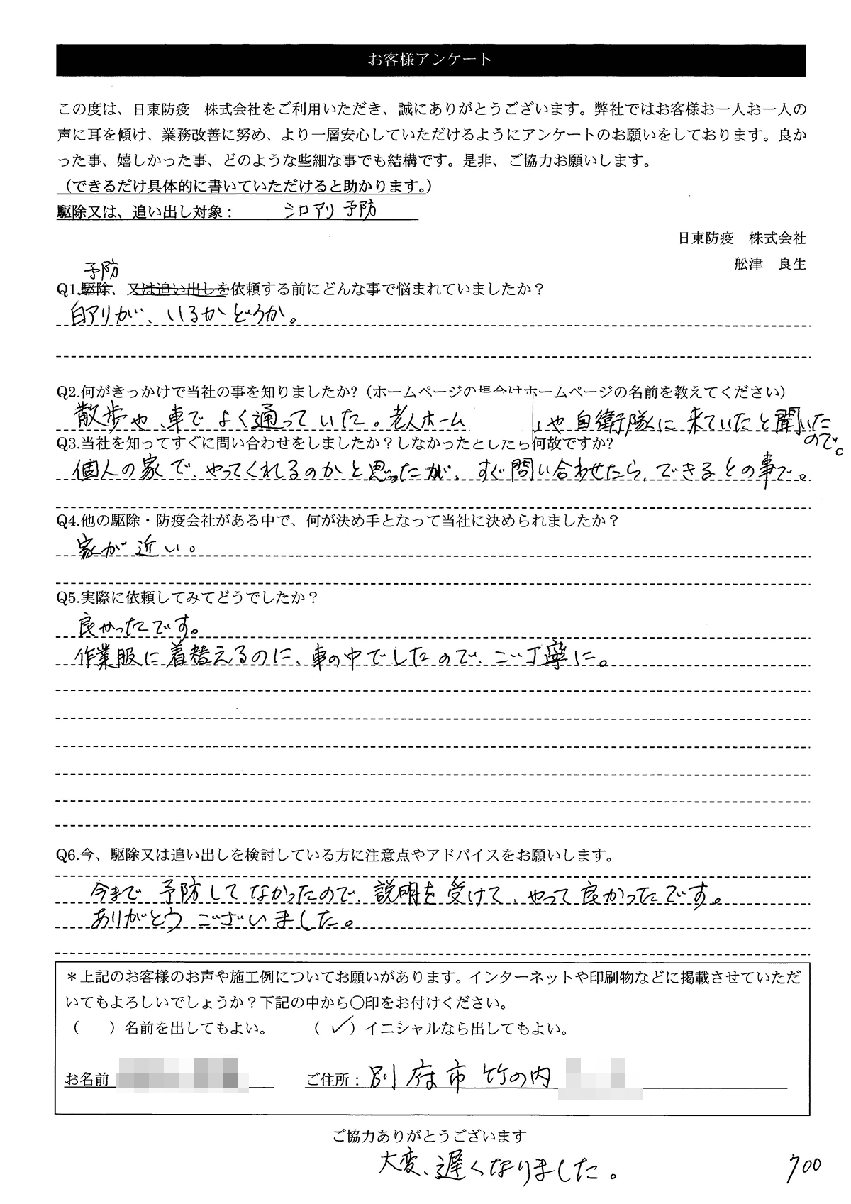 こういった駆除等をお願いするのが初めてだったので、信頼できる御社に依頼して本当に良かったと思っています。