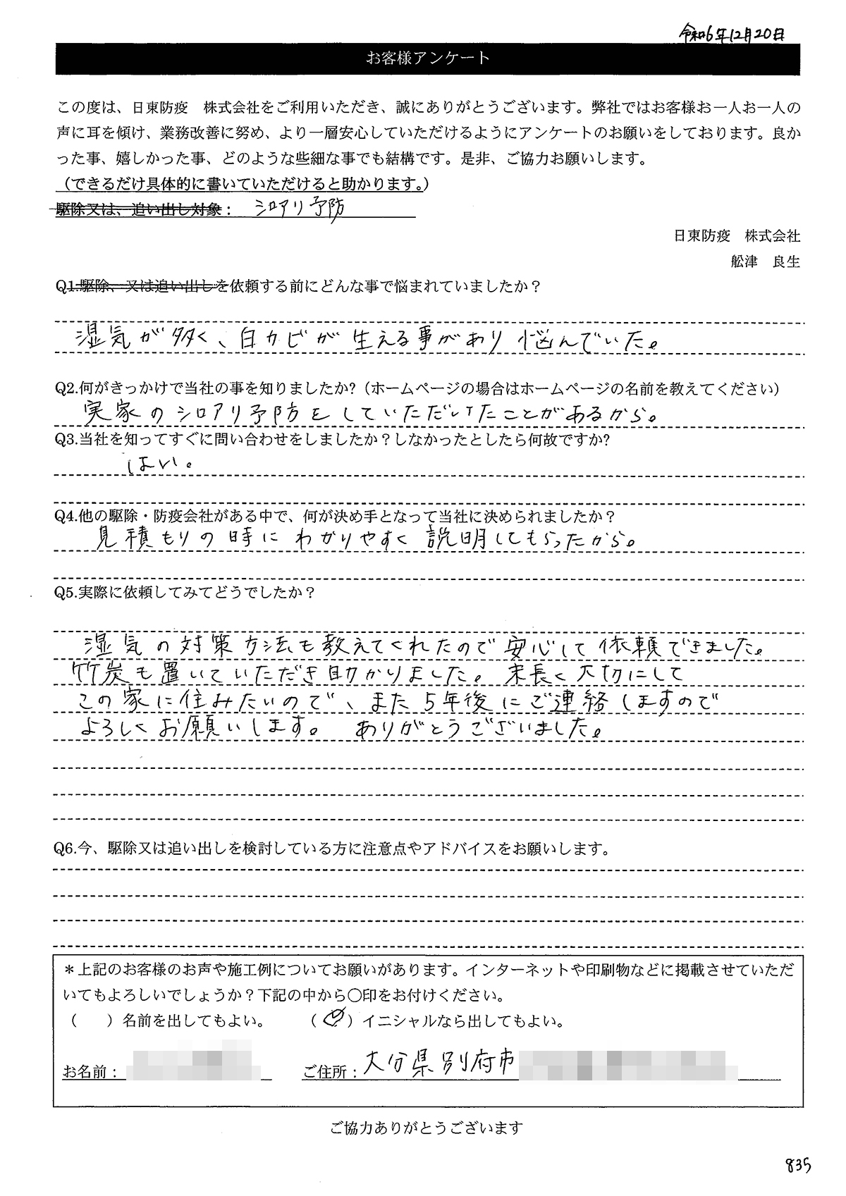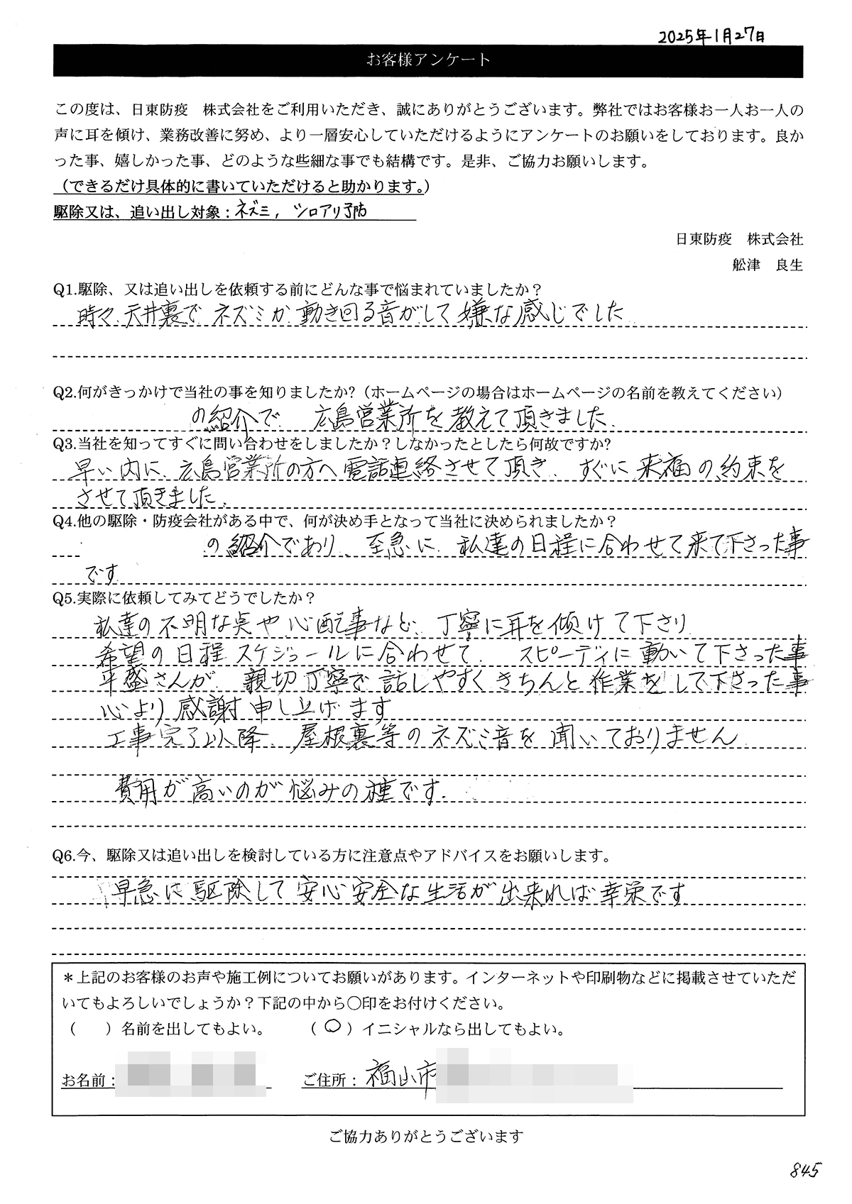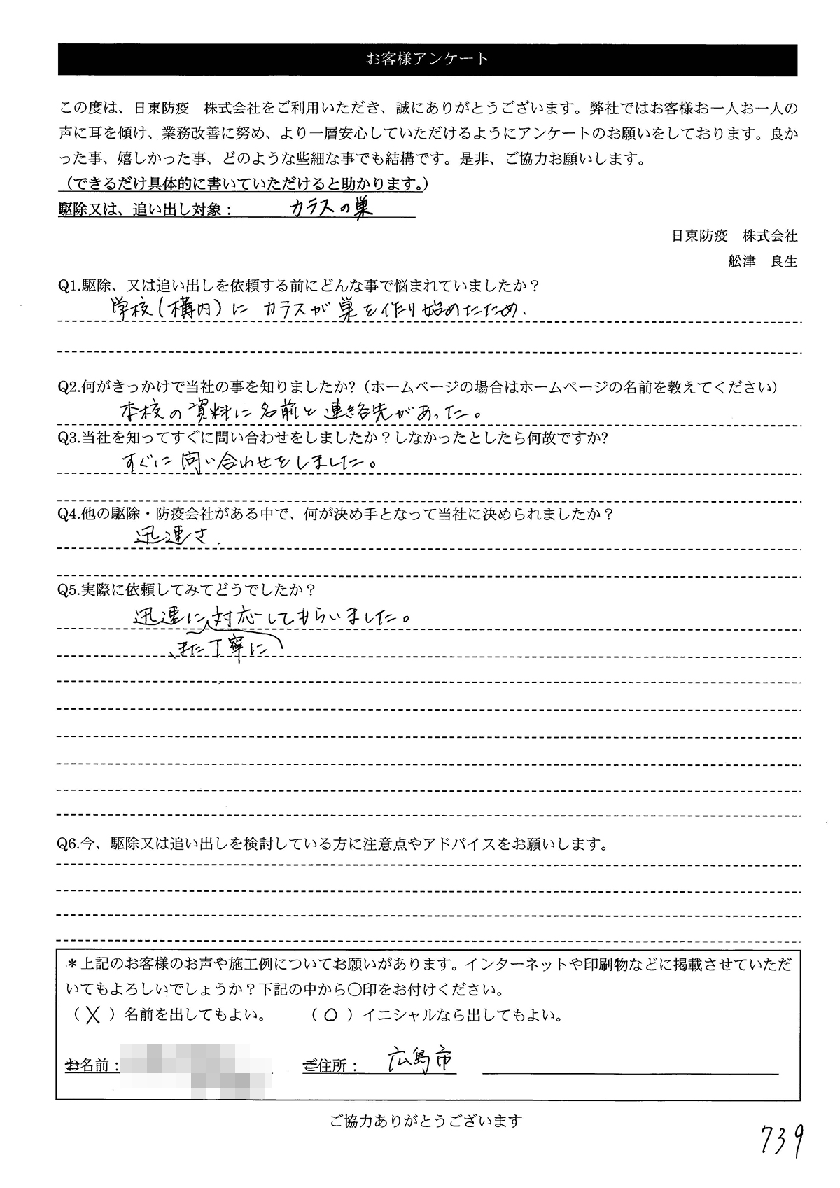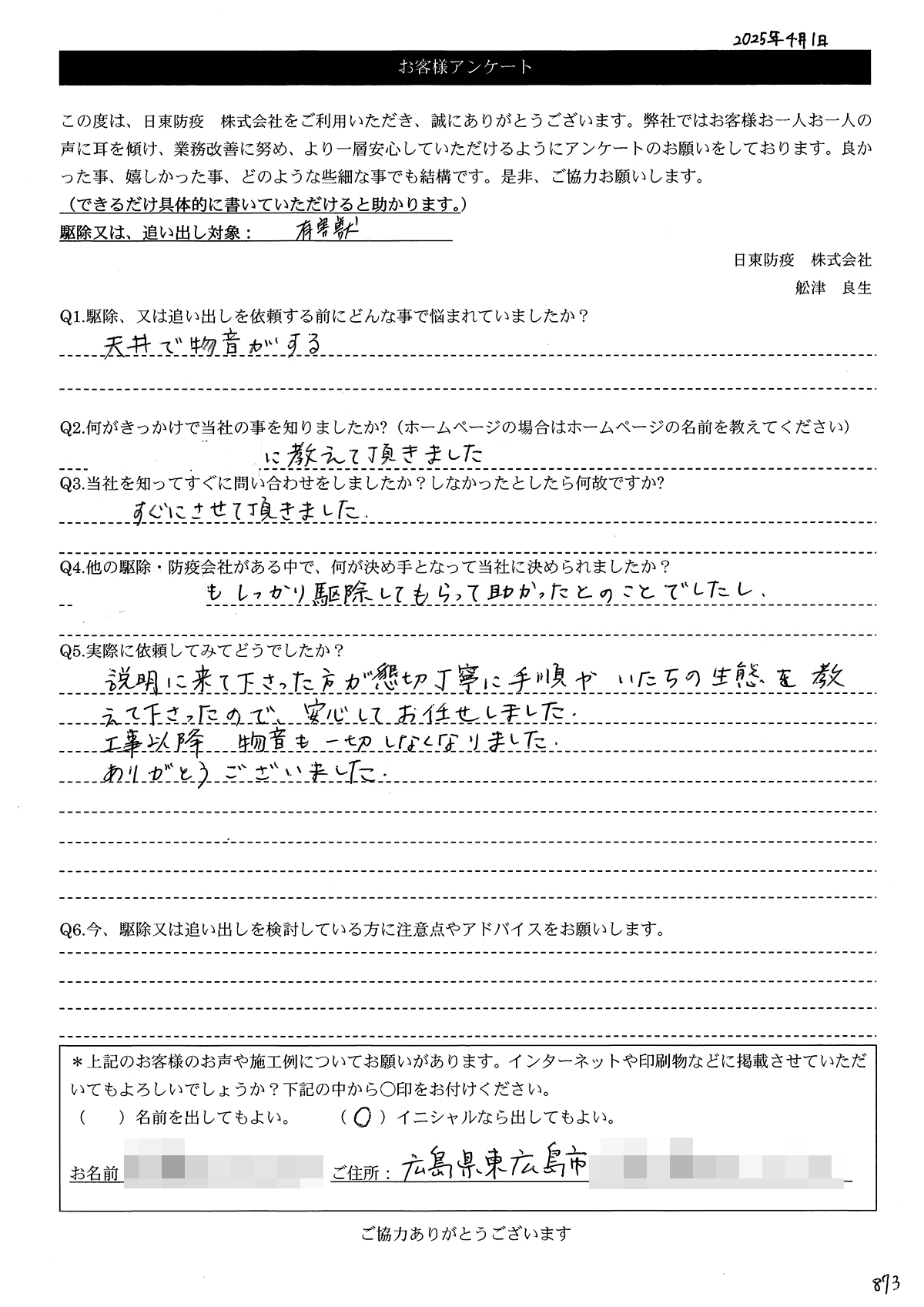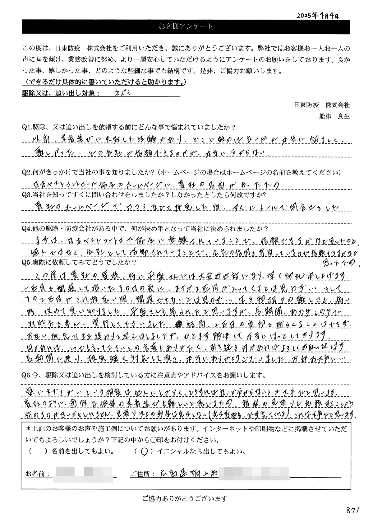 こういった駆除等をお願いするのが初めてだったので、信頼できる御社に依頼して本当に良かったと思っています。