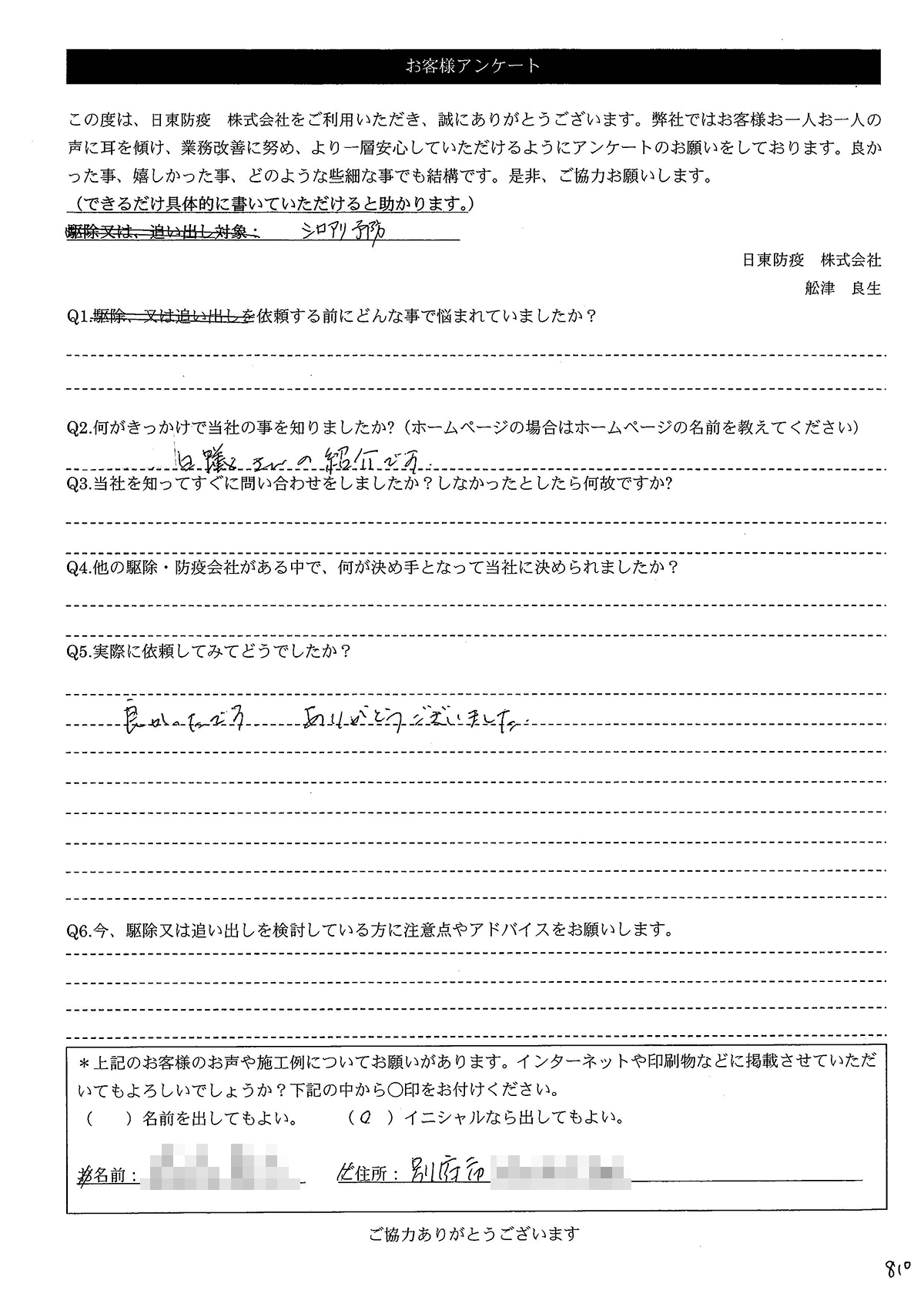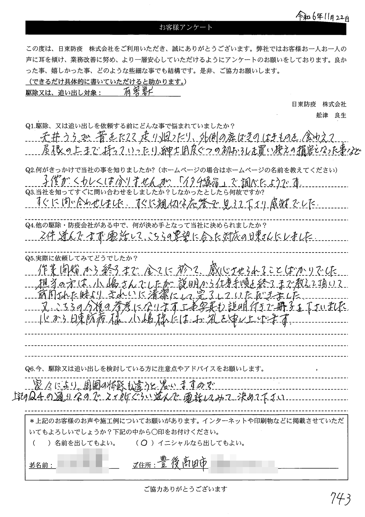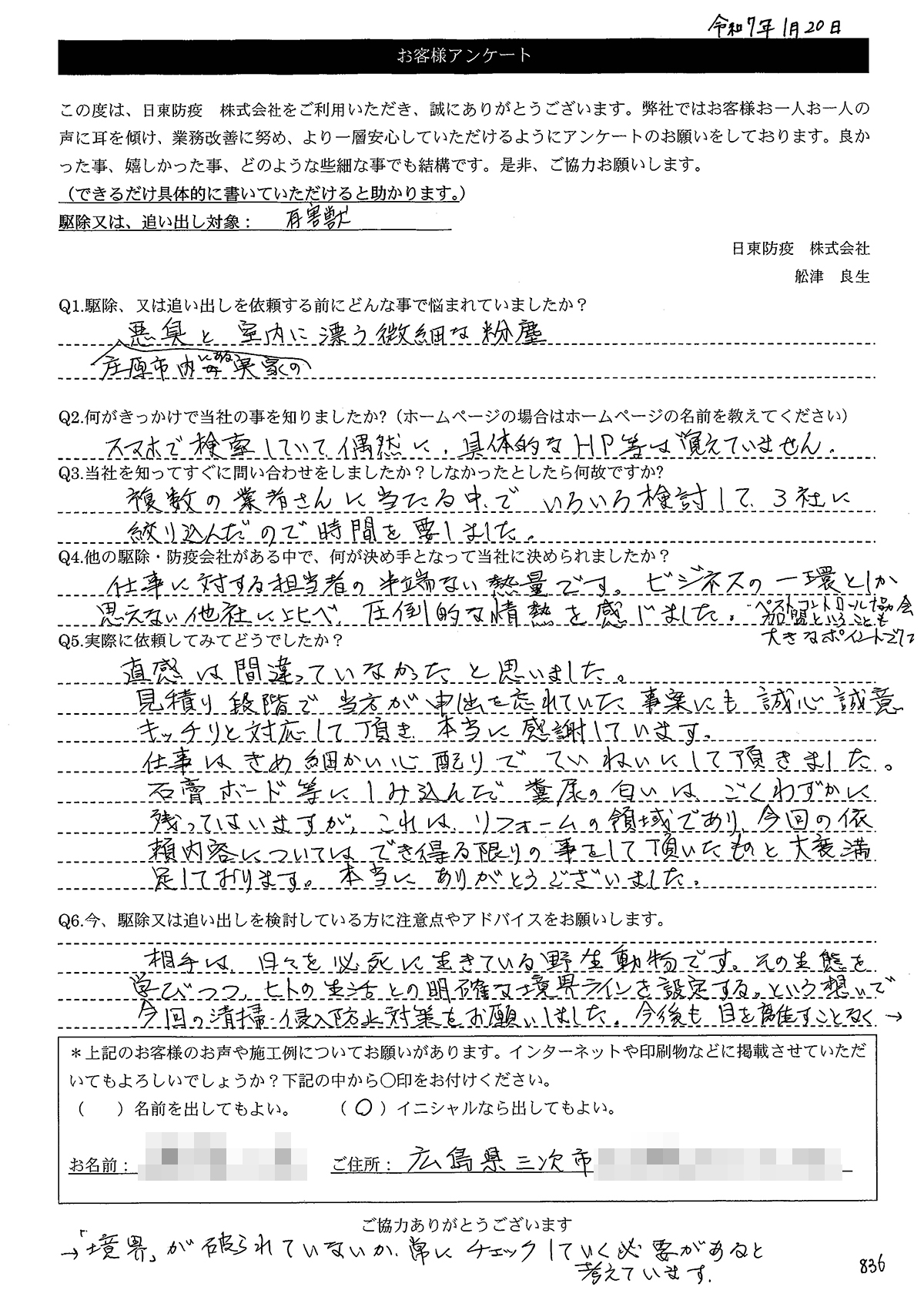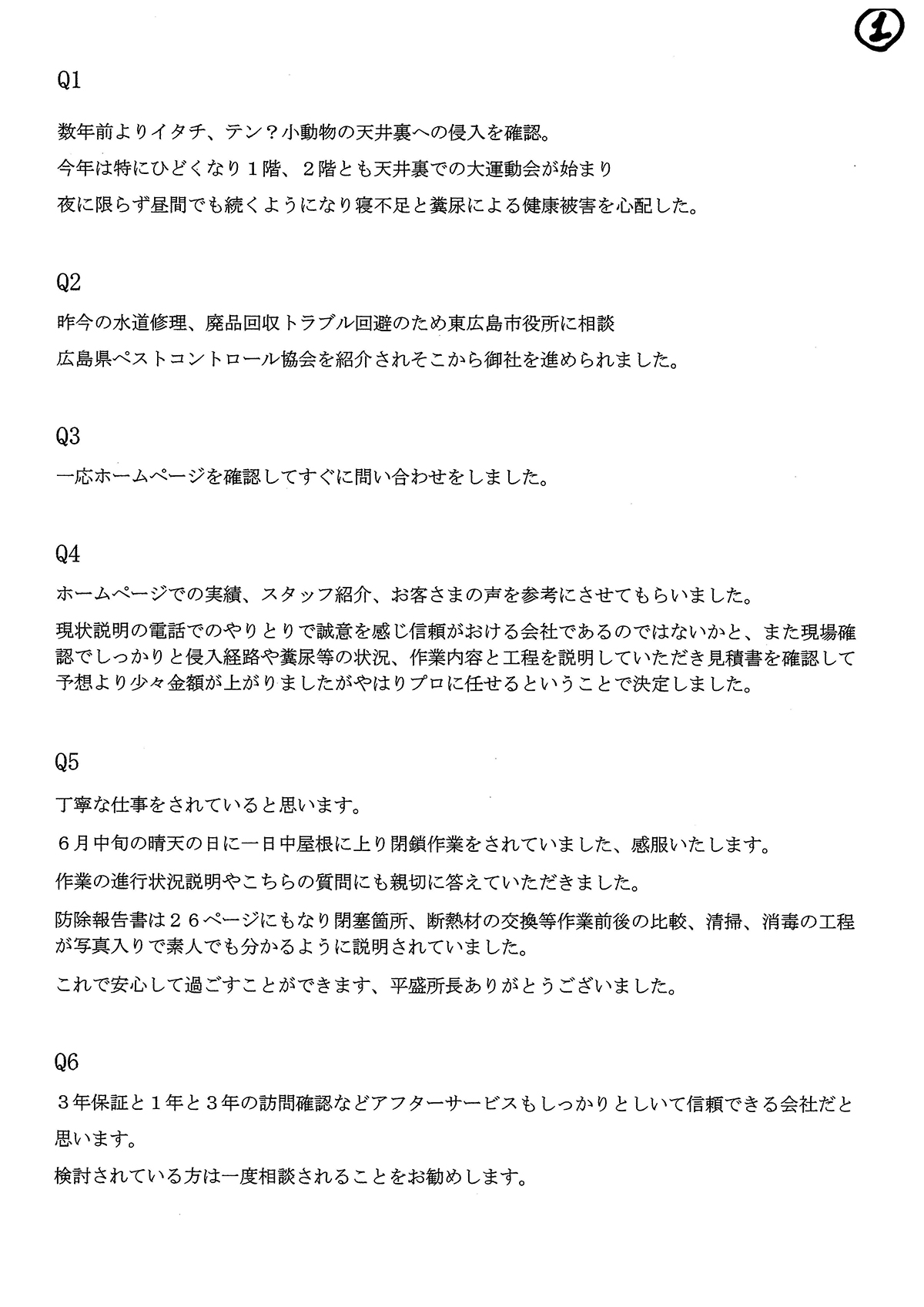 Q6.今、駆除又は追い出しを検討している方に注意点やアドバイスをお願いします。