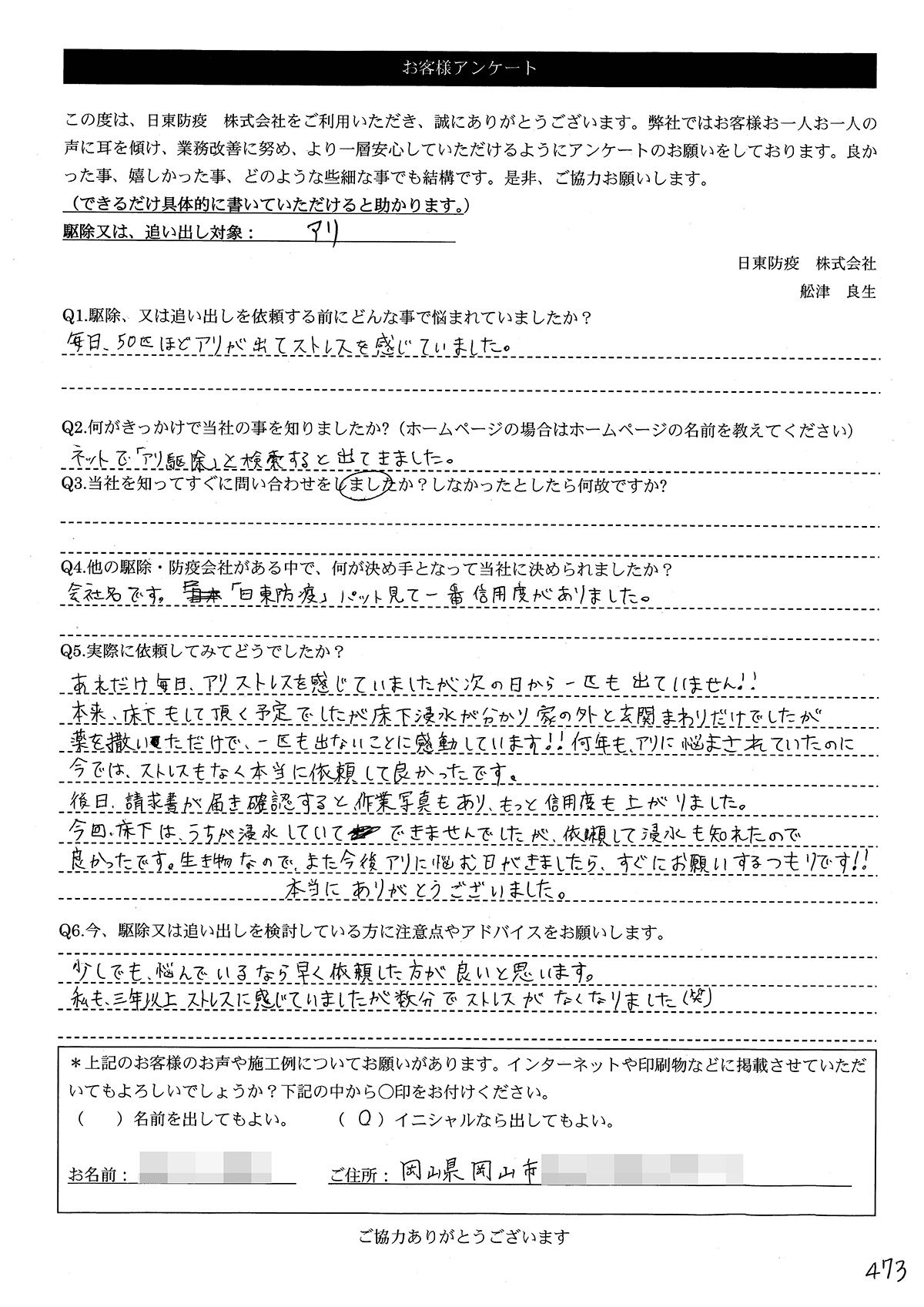 | 毎日、50匹ほどアリが出てストレスを感じていました。 | |