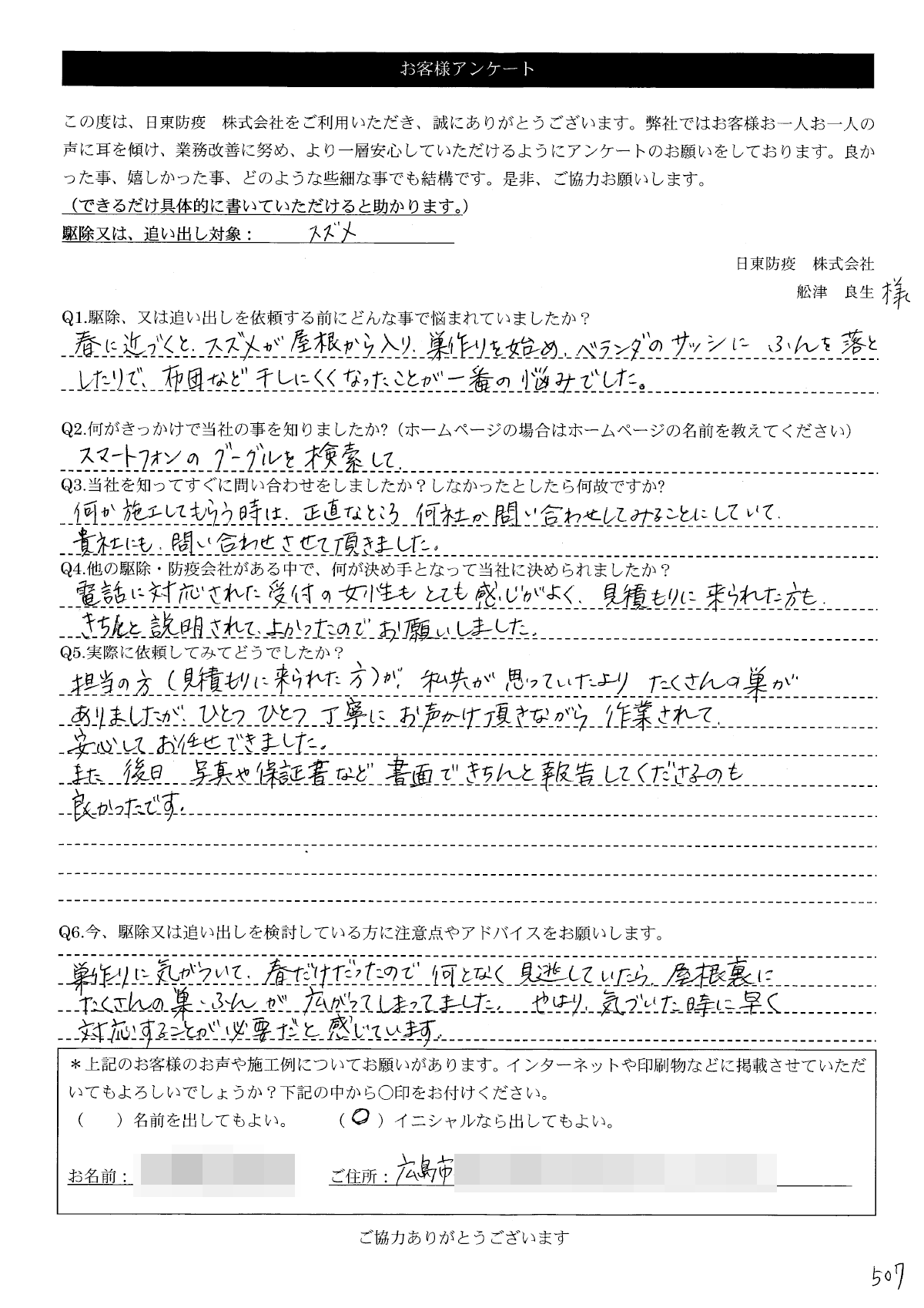 | Q6.今、駆除又は追い出しを検討している方に注意点やアドバイスをお願いします。 | |