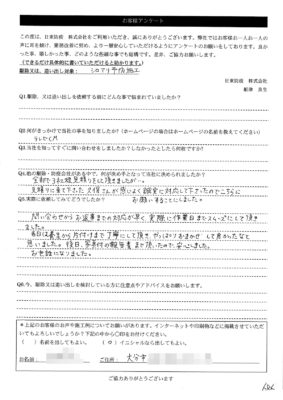 問い合わせからお返事までの対応が早く、実際に作業日までスムーズにして頂きました。