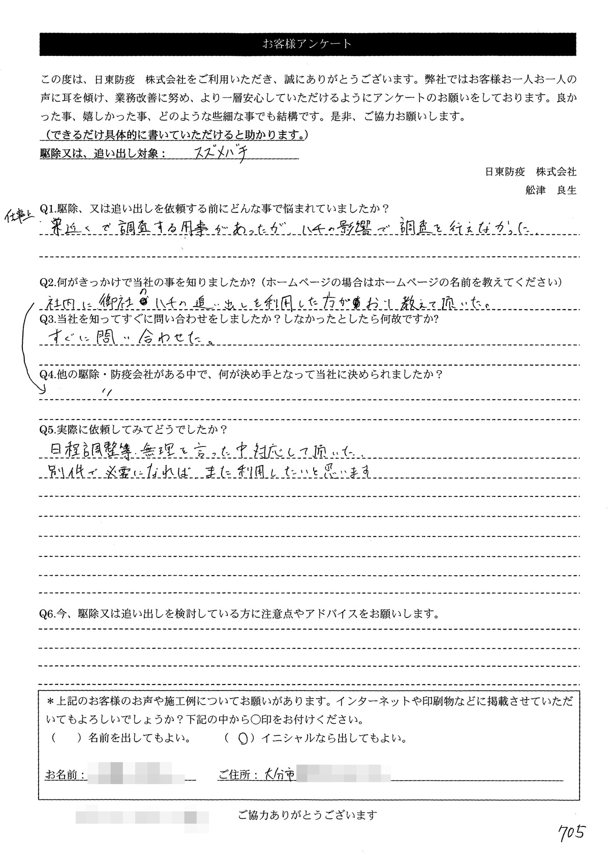 社内に御社のハチの追い出しを利用した方がおり、教えて頂いた。 |