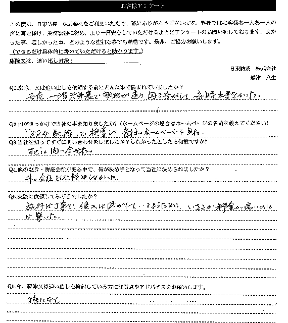 天井、床の下のすべてを調査され、追い出し工事後、20日間程度様子見を行い、今のところ、侵入は止まったようで安心しています。又、今後1年間は保証付きで、異変があったらすぐ対処してくれるとのことで、安心しています。