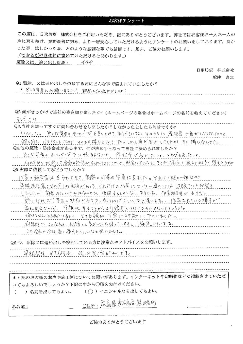 | Q6.今、駆除又は追い出しを検討している方に注意点やアドバイスをお願いします。 | |