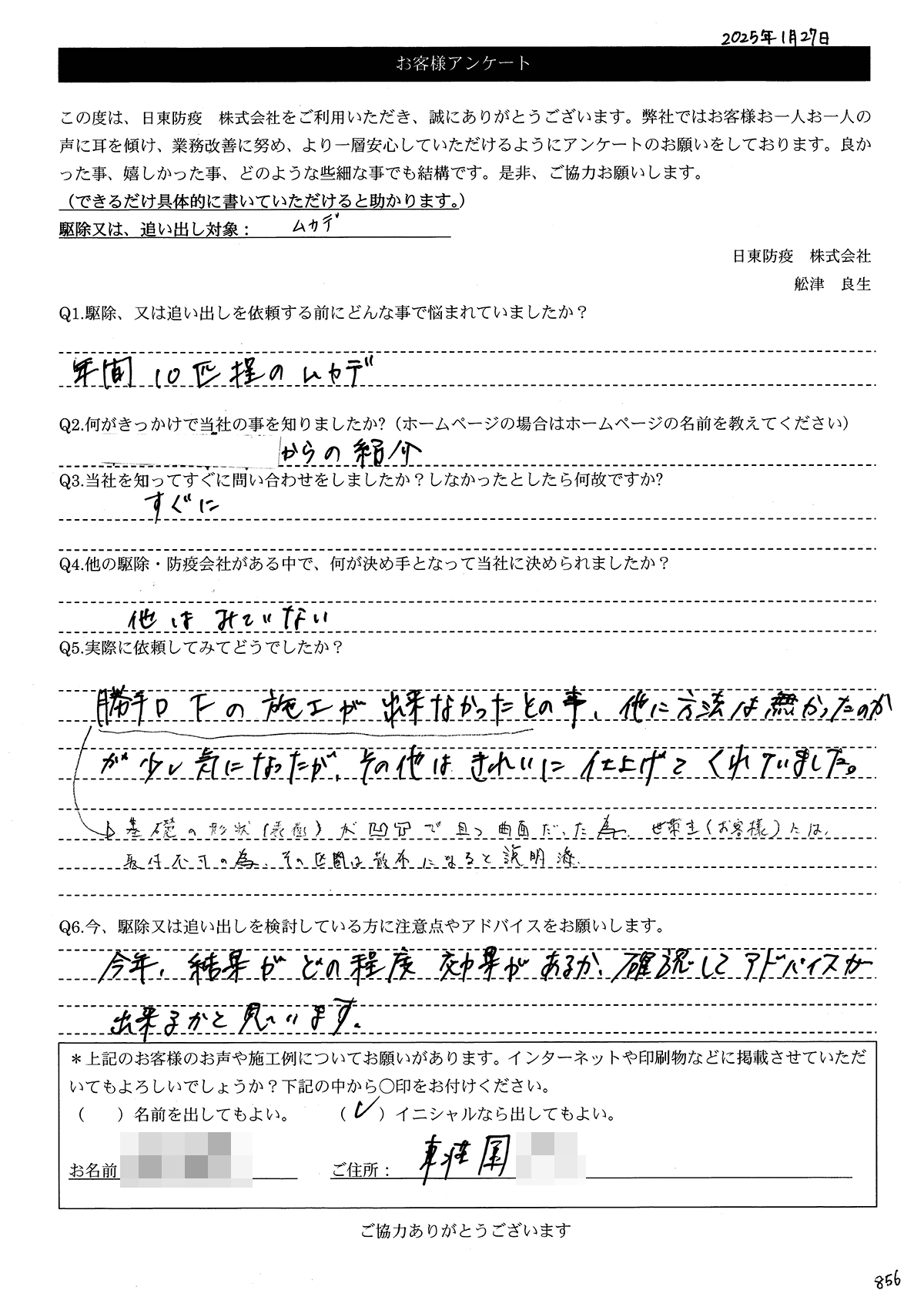 | Q6.今、駆除又は追い出しを検討している方に注意点やアドバイスをお願いします。 | |