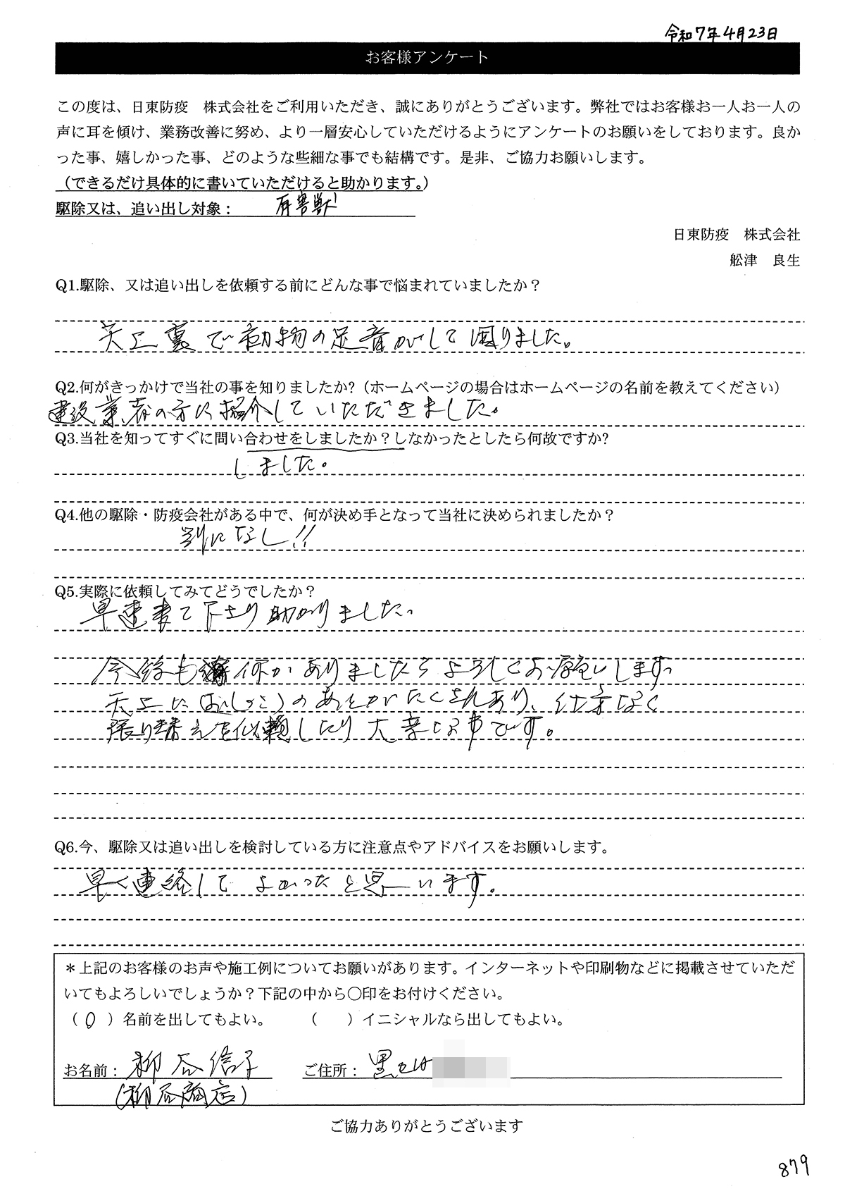 | Q6.今、駆除又は追い出しを検討している方に注意点やアドバイスをお願いします。 | |