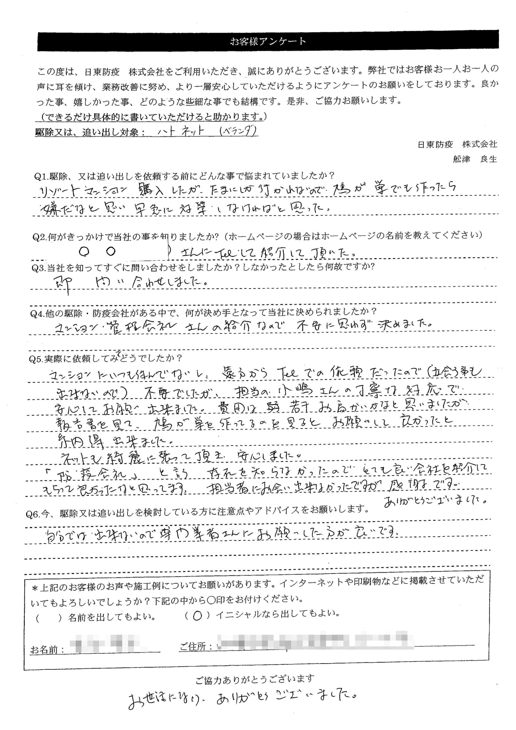 | マンションにいつも住んでいないし、遠方からTELでの依頼だったので(立ち会うこともできないので)不安でしたが、担当の小嶋さんの丁寧な対応で安心してお願いできました。費用は若干お高いかなと思いましたが報告書を見て、鳩が巣を作っているのを見るとお願いしてよかったと納得できました。ネットもきれいに張っていただき安心しました。「防疫会社」という存在を知らなかったのでとても良い会社を紹介してもらってよかったなと思ってます。担当者にお会いできなかったですが、感謝です。ありがとうございました | |