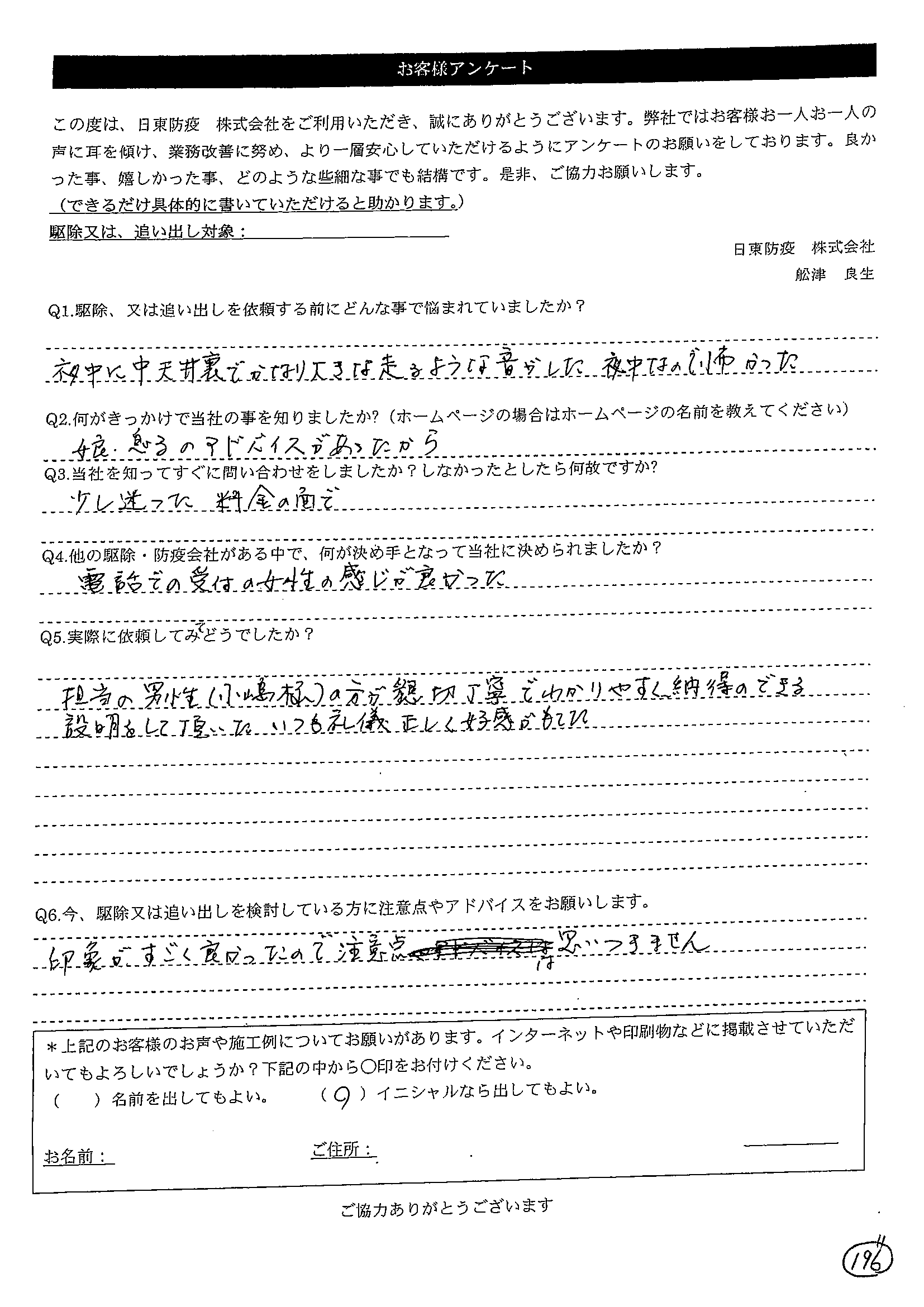 | Q6.今、駆除又は追い出しを検討している方に注意点やアドバイスをお願いします。 | |