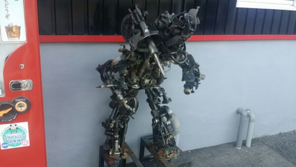 朝、歩いて通勤している途中の車屋さんで毎日見かけている車のパーツで作られたロボットの模型!この車屋さん好きなんですね。しかし、良く出来ていますね!
