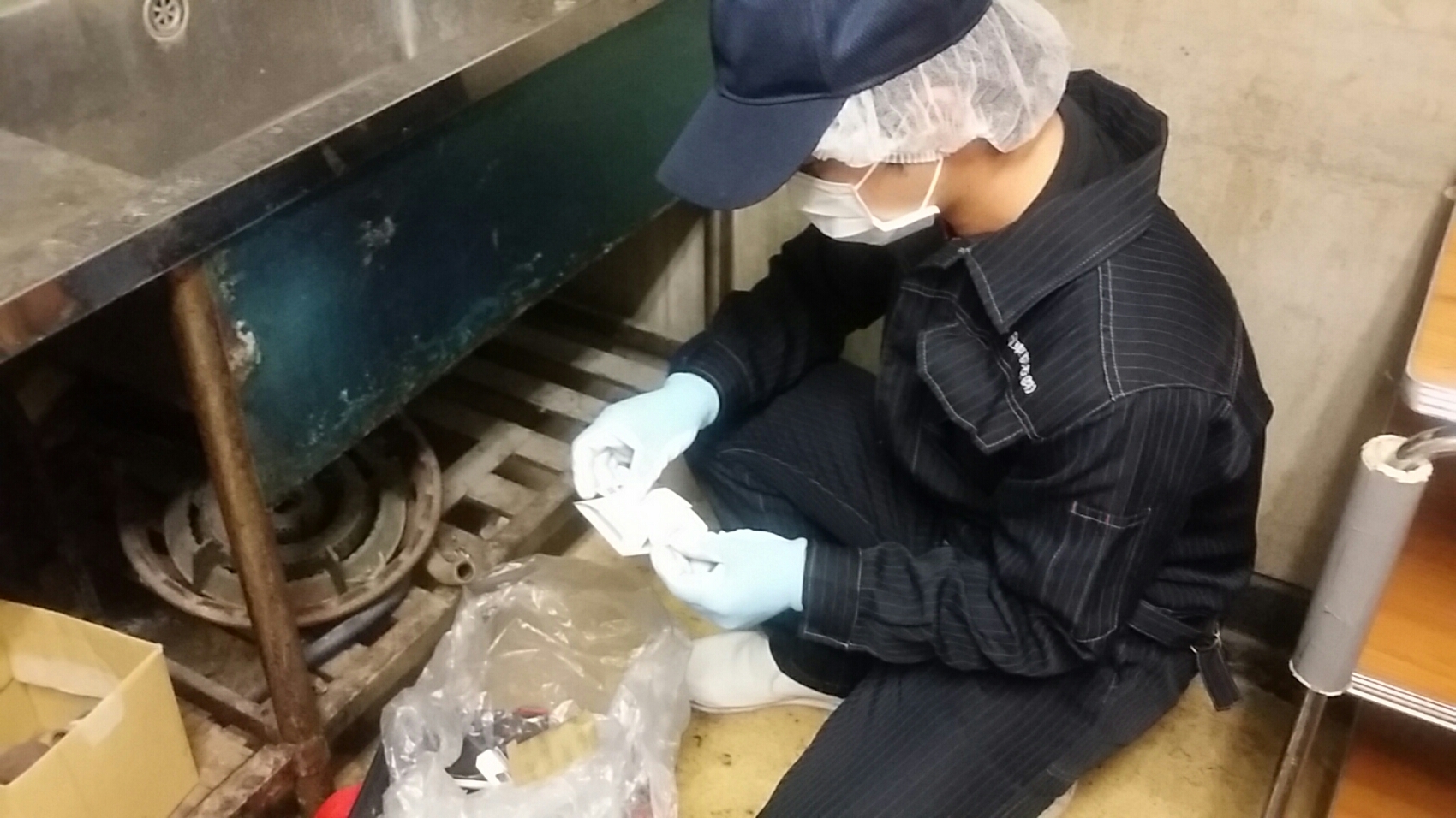 このモニタリングトラップを確認して状況を把握します。今回はオオチョウバエの捕獲が見られました。対策を講じて処理を行っています。建物も老朽化が進んでいるので上手くコントロールを考えて対応していかないと難しい面もありますね。