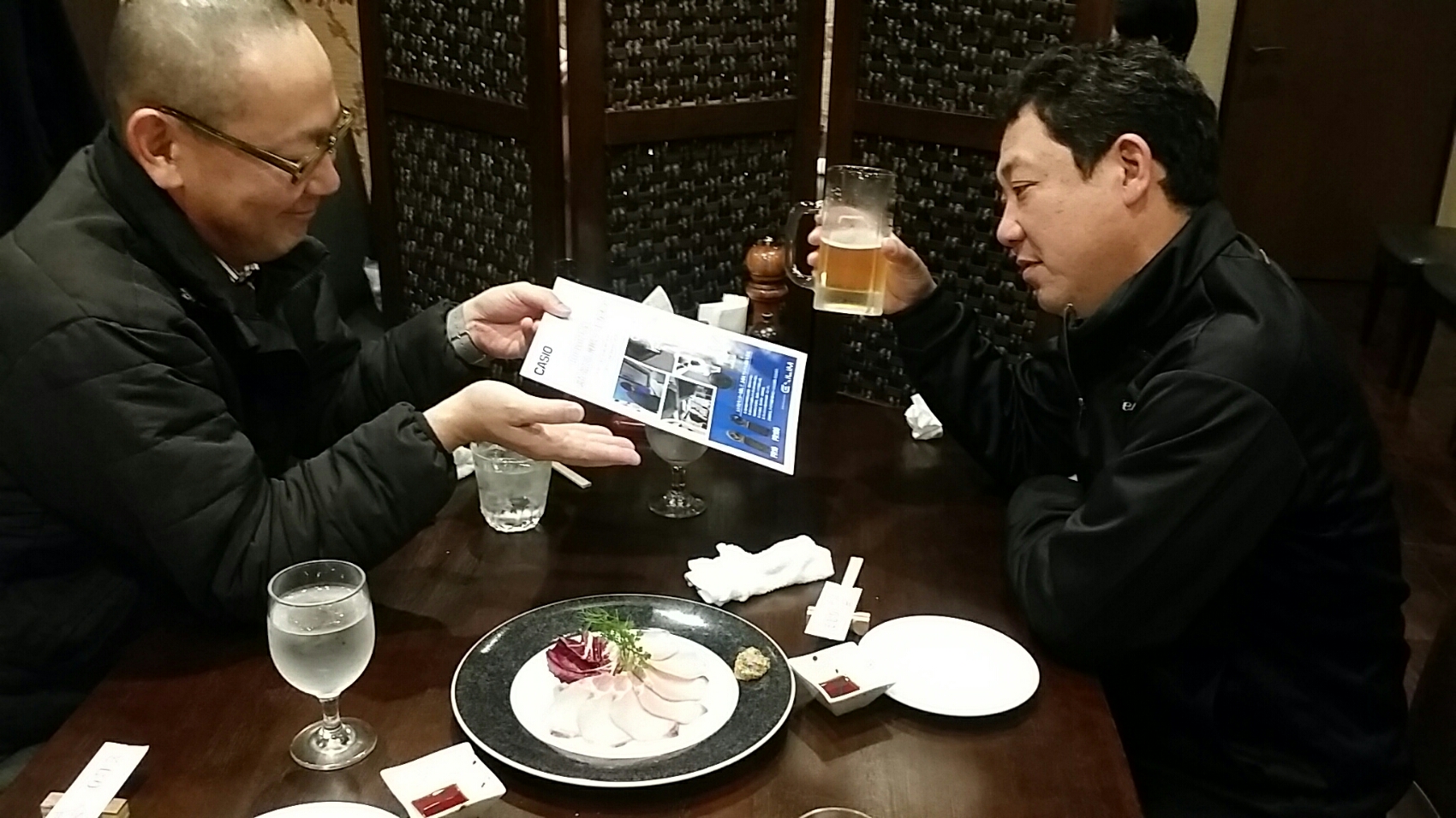 出張から帰ると業者さんと食事しながら打ち合わせでした。またまた、あのニコラスチモツさん。飲みながら押し売りされています。