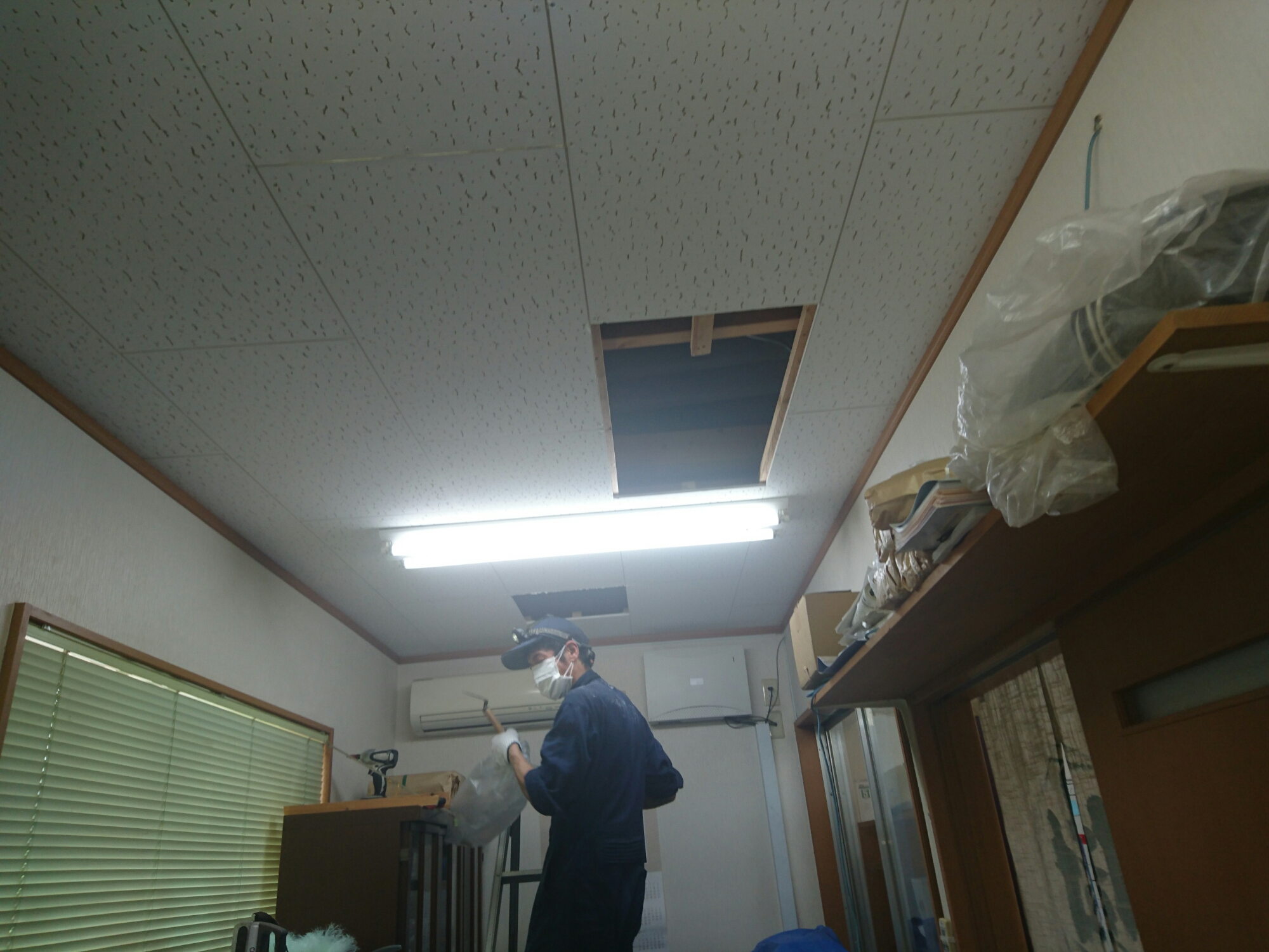 お昼からは佐藤、L’Arc高松現場に合流して、天井裏の臭い対策、天井裏に動物の死骸が原因で凄まじい臭いでした?⤵⤵!。断熱材を回収して新たに引き直し、天井を張って終了です!