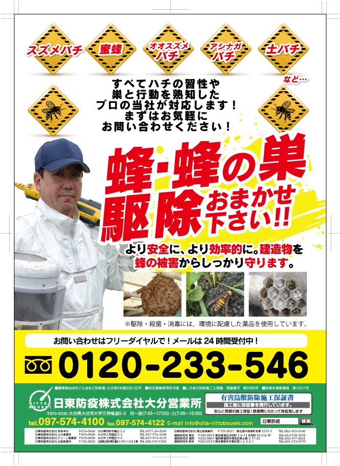 ここ最近は、蜂のご依頼が多く時間に追われての対応です。特にスズメバチは殺刺被害が出る前に現場へ行きたいですが、現場距離や時間を上手く調整しても、この時期は時間と人が足りません。しかし、何とかスピード対応は心がけます。