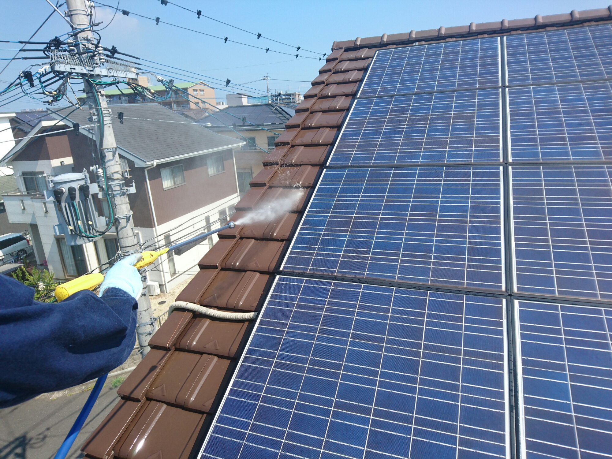 まずは、太陽光パネルのドバト対策!屋根の上に糞を落としているので、高所作業車を使い、高圧洗浄を行います!