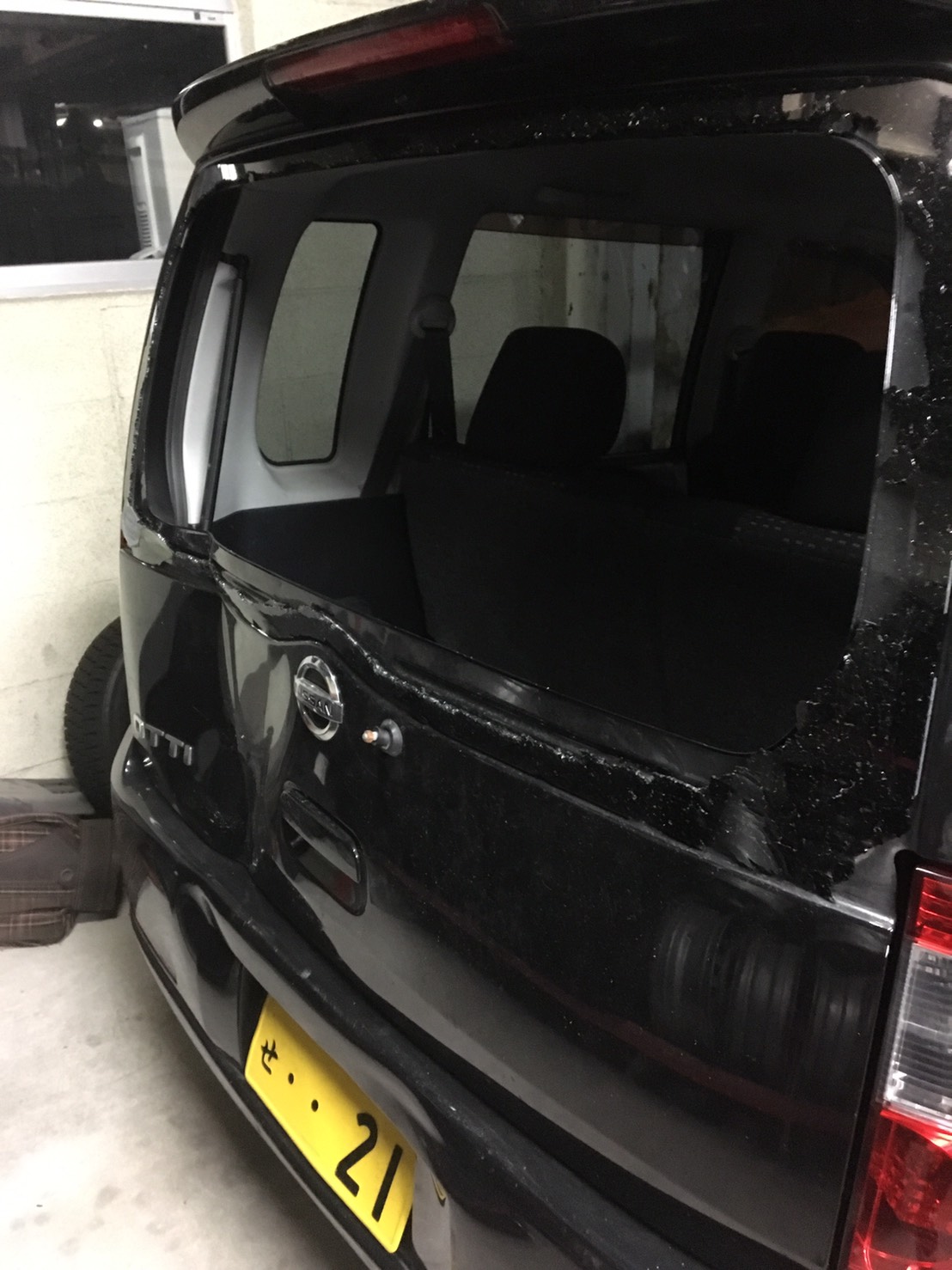 夕方にうちのスタッフがお客様の所で作業中、駐車場に止めていたら気が付かずバックでうちの作業車に後ろから突っ込まれて、トランク、後ろ回りはグッシャリいってしまいました!