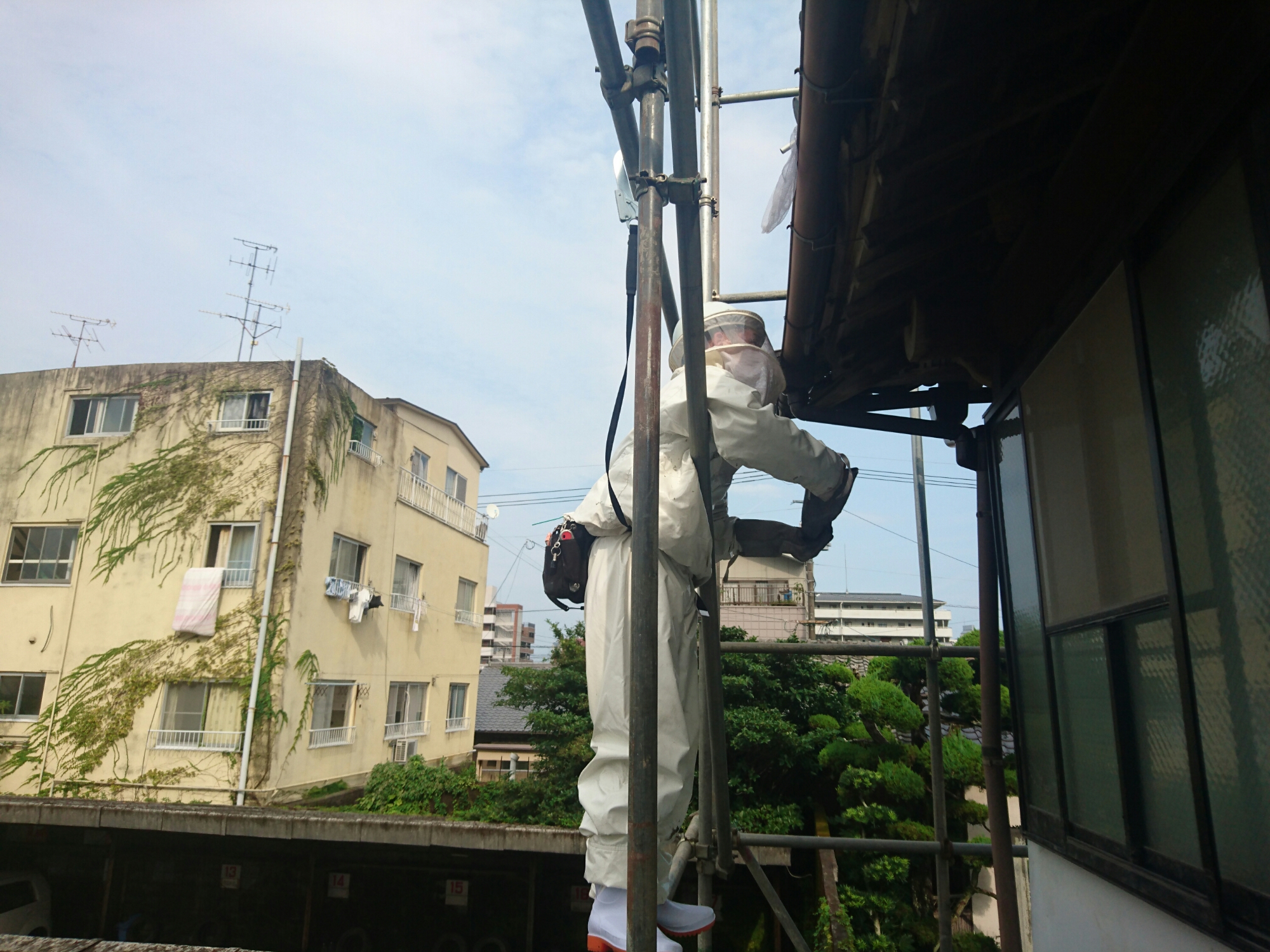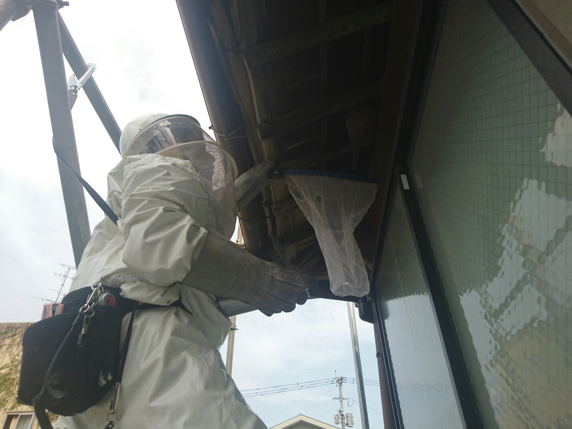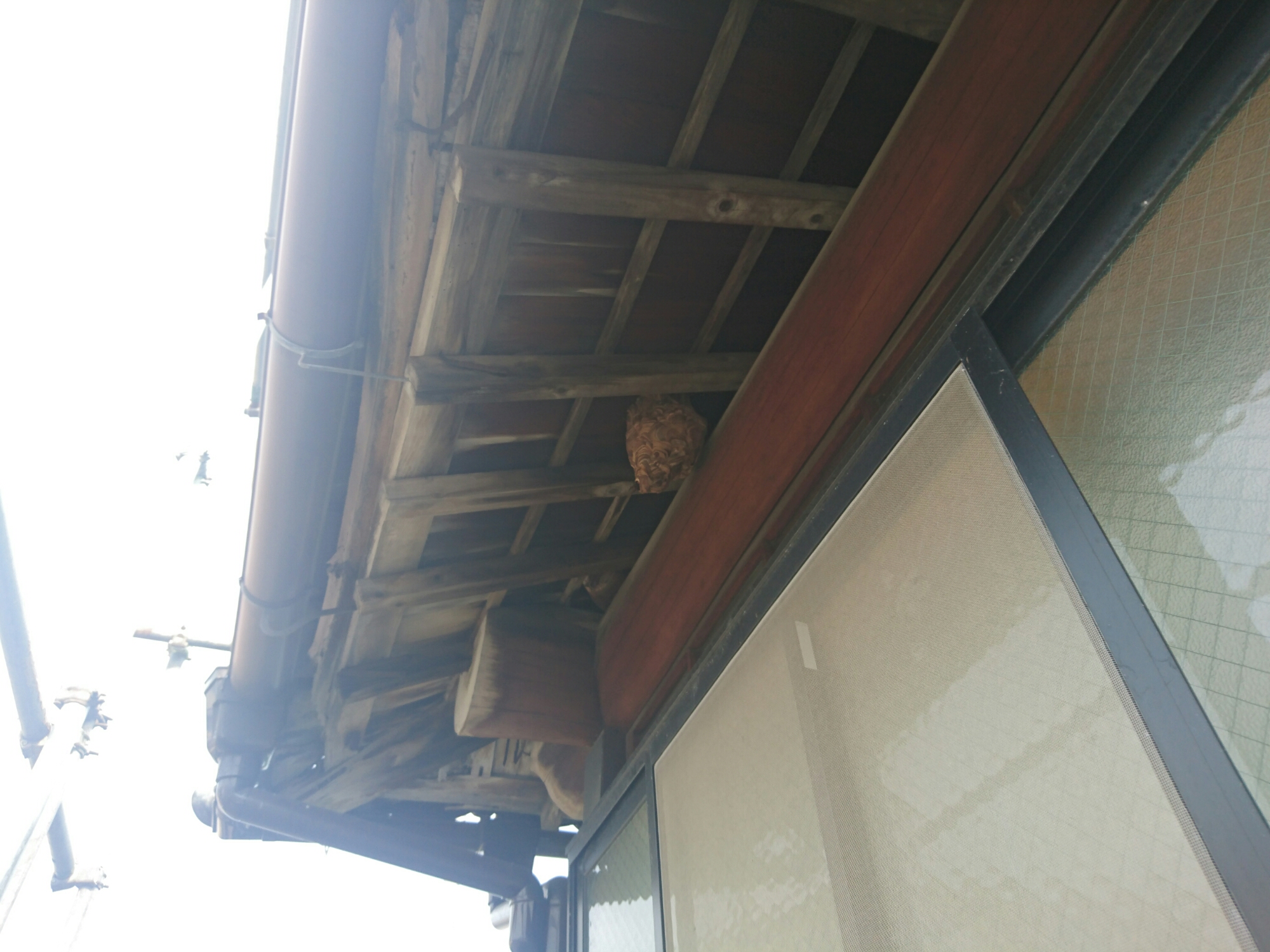軒下にスズメバチの巣があります!当たり前の事ですが、足場の悪い所での作業は安全面を考えてしなければなりません。