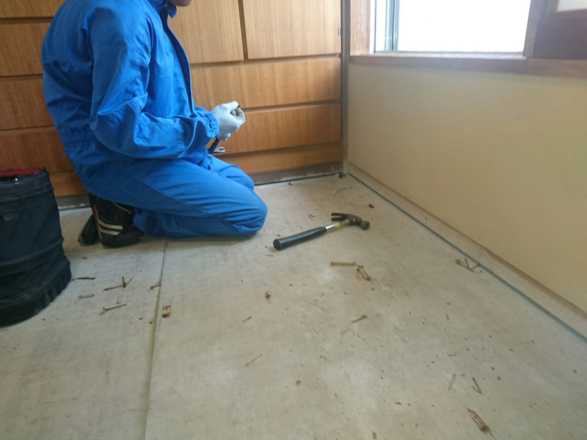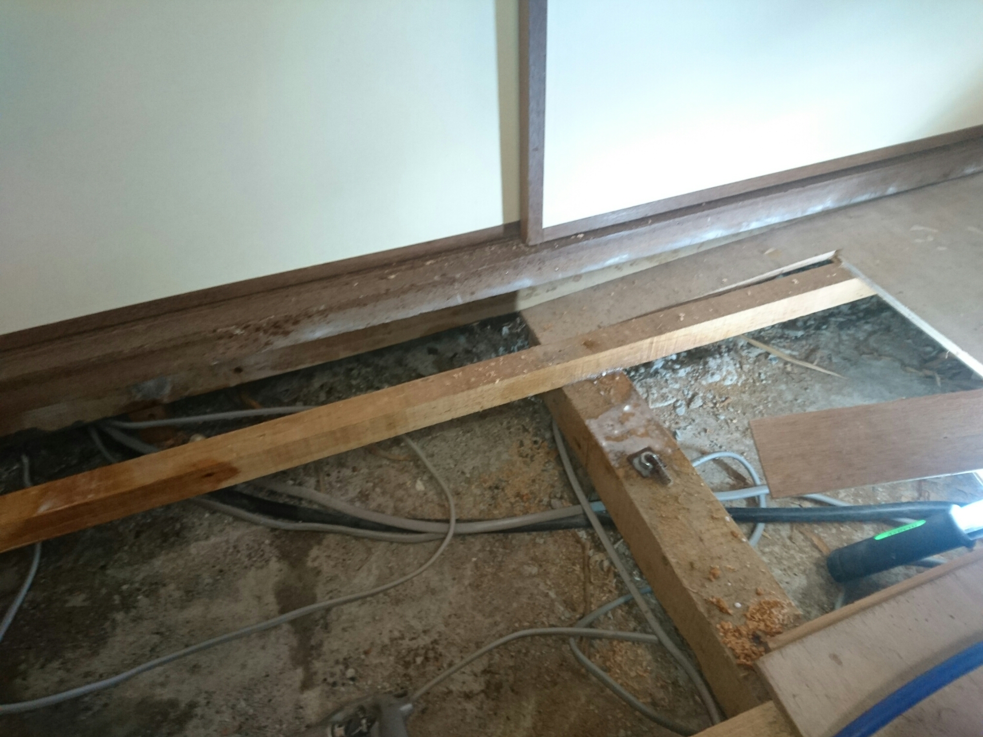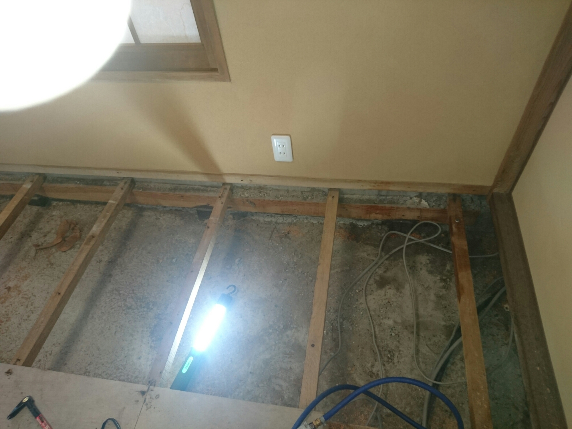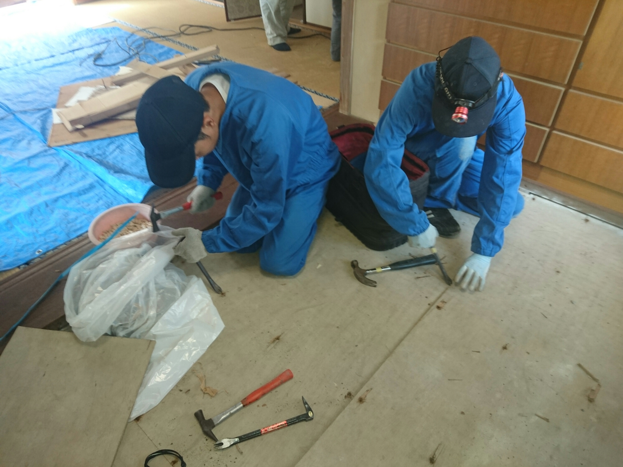 先ずは床下が狭くて体が入れない為、畳を上げて、床板を全て剥いでいきます。