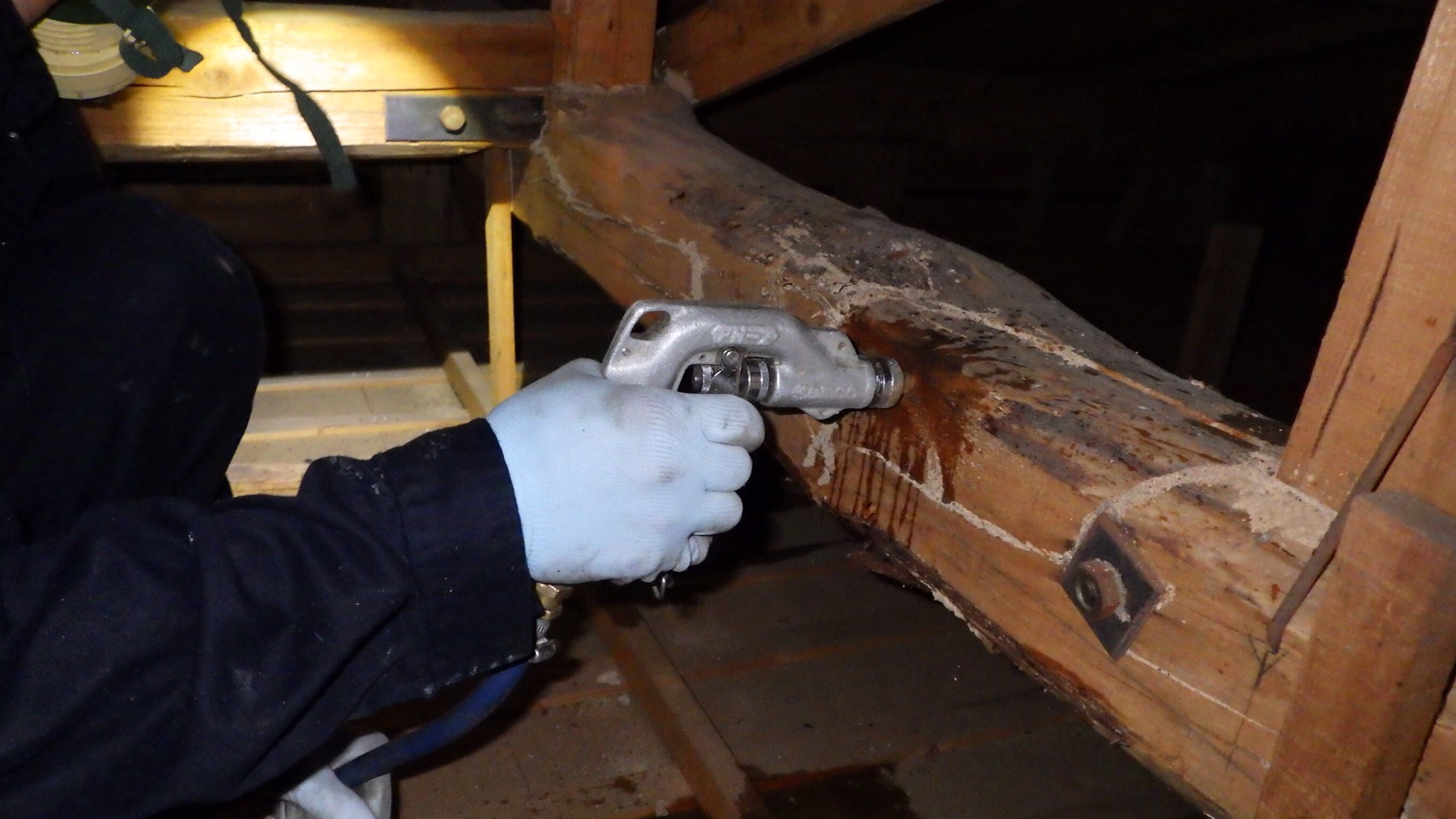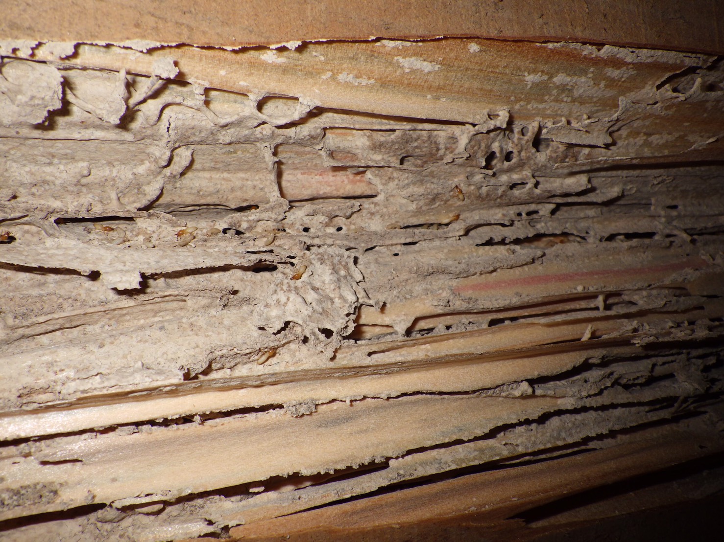 小屋裏から被害です。この種類は湿気がなくても、自分で道を作って何処までも突き進む能力があります!昨年は14階のマンションで被害を確認しています!恐るべしイエシロアリです。