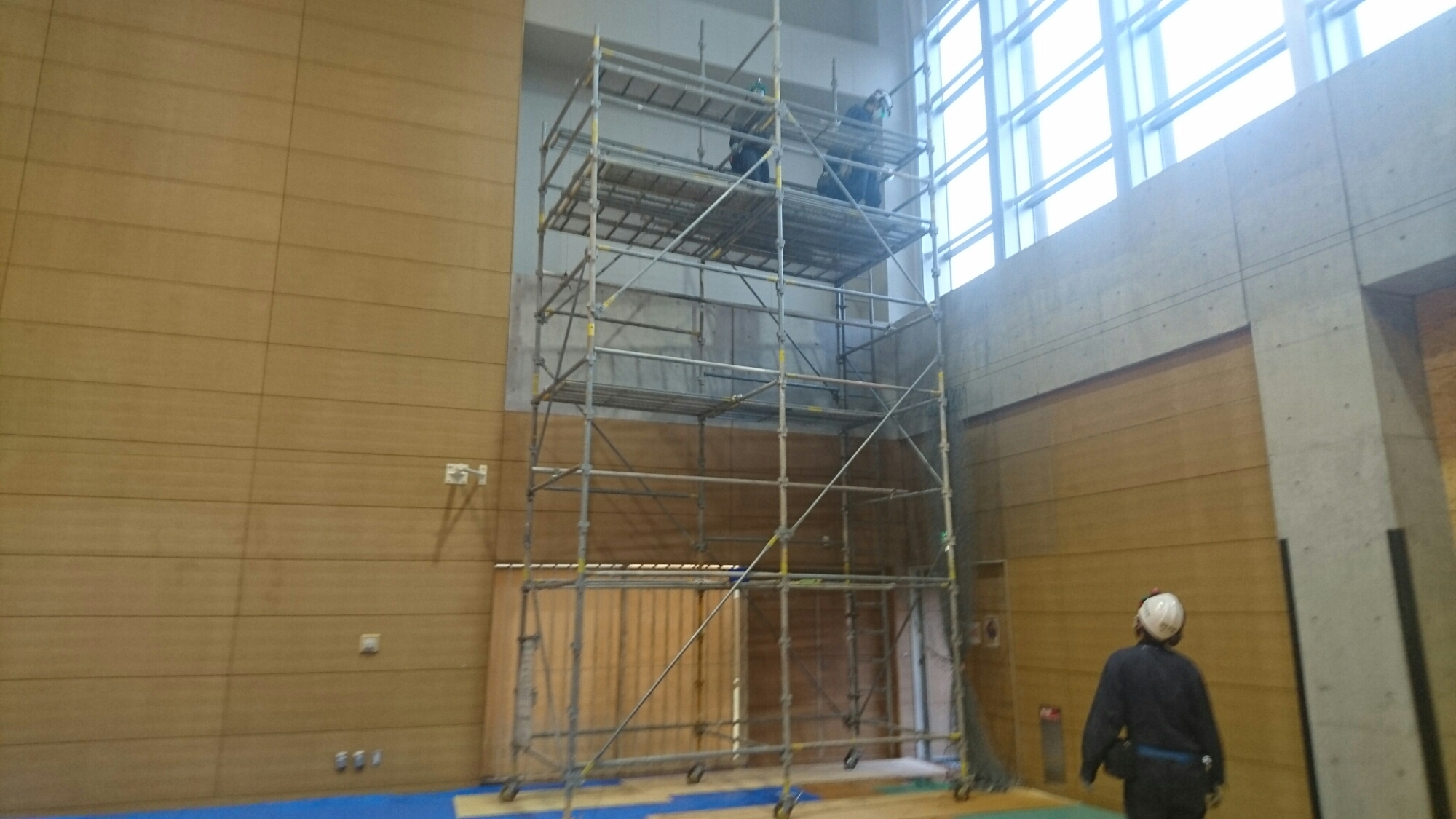 ヒラタキクイ虫駆除です。スポーツ施設の壁面に被害が広範囲に発生しています!