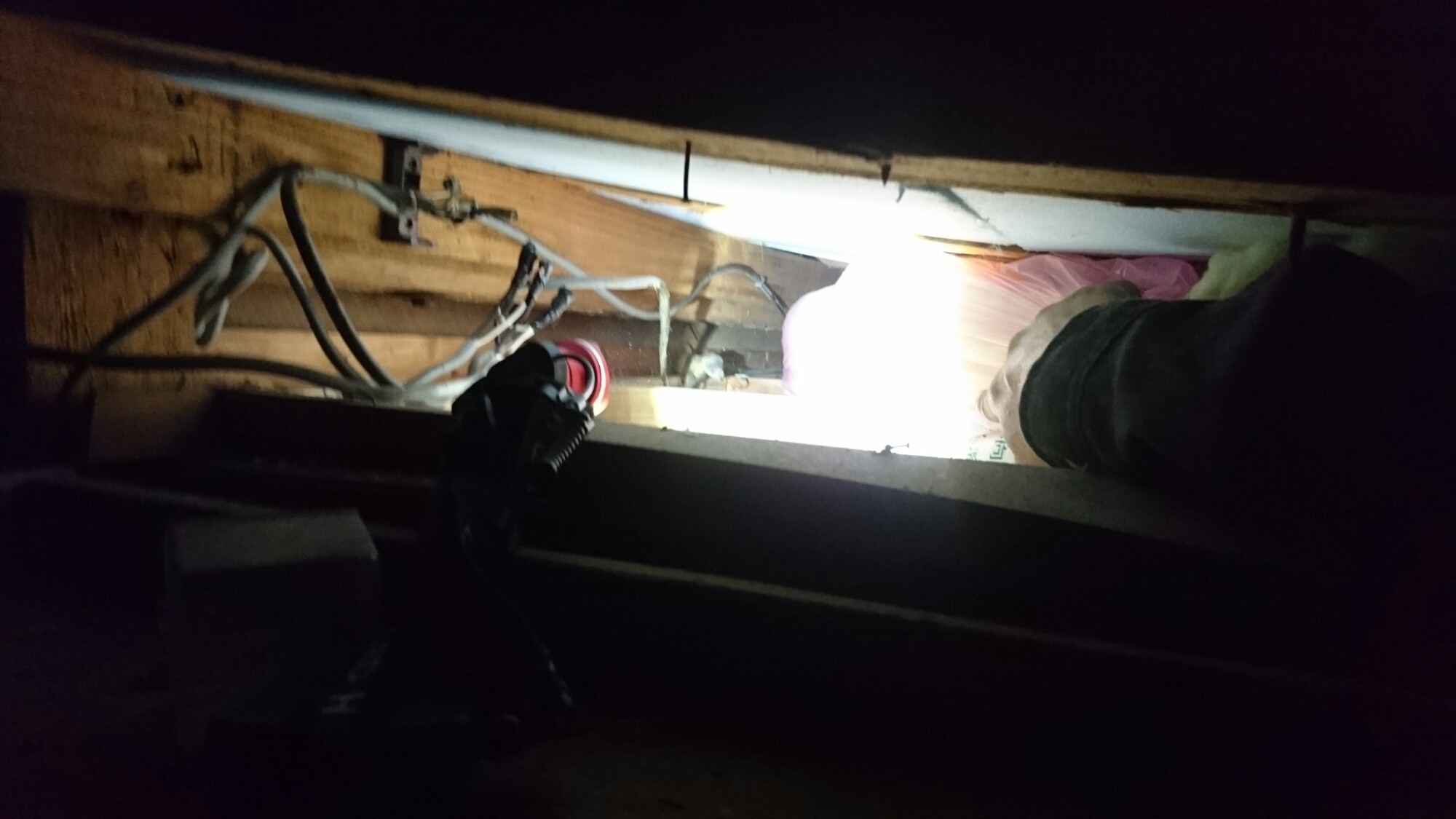 天井裏から泣き声がしています!しかし、軒天井部分は狭くて人間が入れないスペースです。どうするかな?親イタチは出て行っていない状態…。泣き声が響く…!