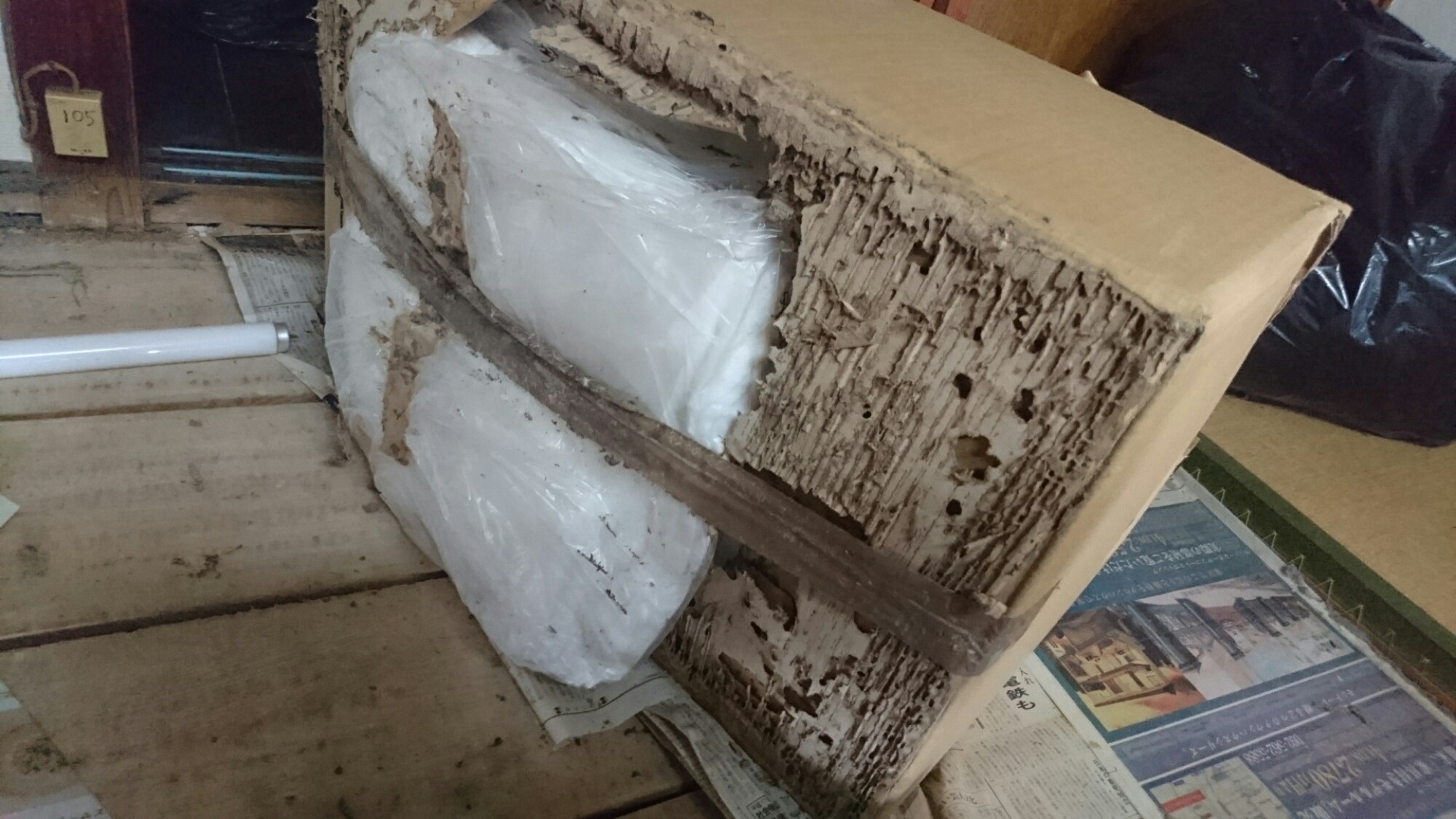 特にこのように、段ボールを長期間放置しているとこ、このようなシロアリ被害はよく目にします。今度は被害にならないように処理をしていますが、どうしても片付けやいらないものが溜まってくると、この状態になることがあります!やはり、整理整頓や片付けを行う事から始めるとあまり費用も掛からず、被害を最小限に押さえる事ができます。