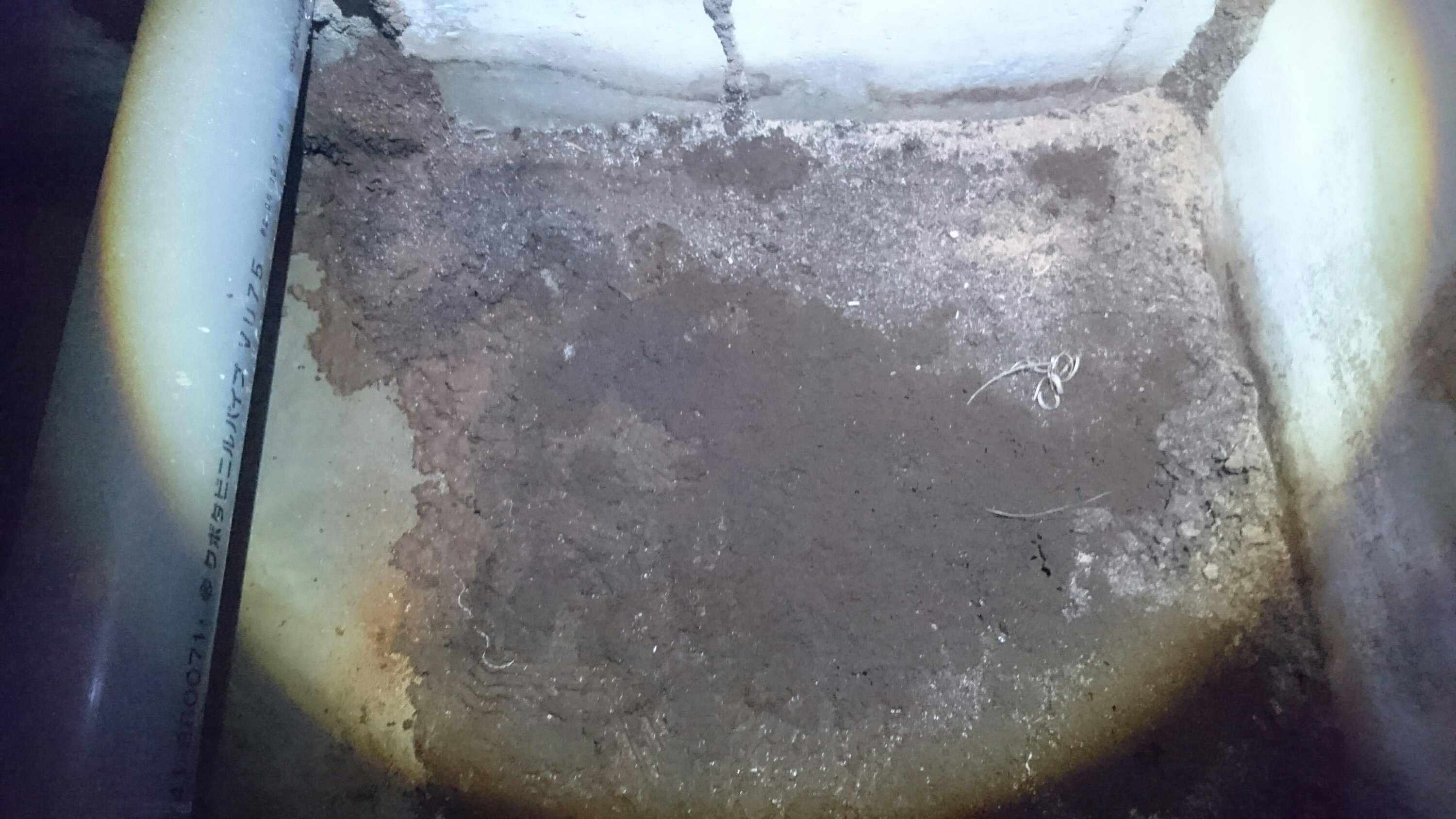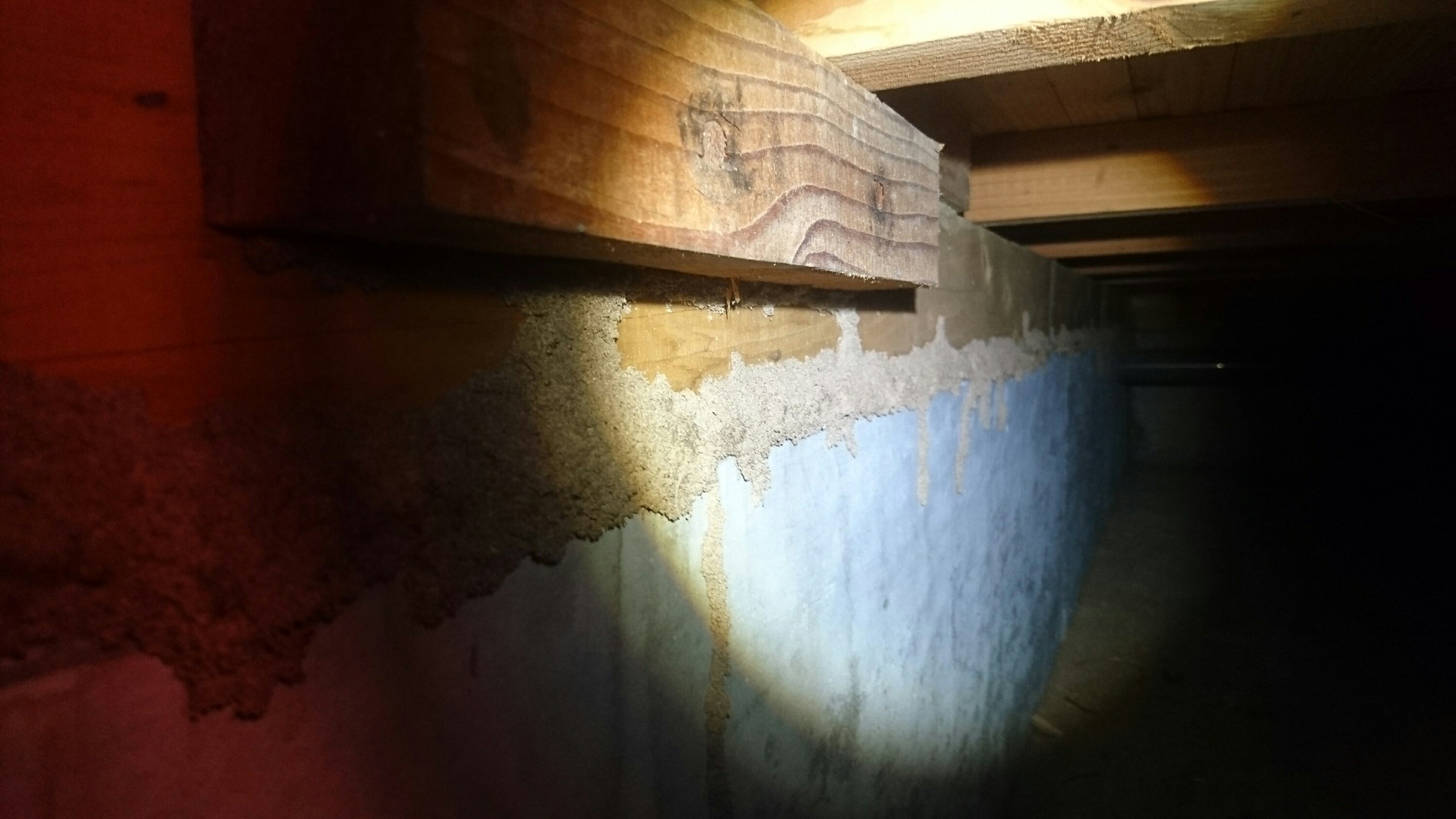 脱衣場の床下調査の写真ですが、何でここだけ土かな?と思ったら、これがシロアリの巣?!コンクリートの床面に広がっています!⤵