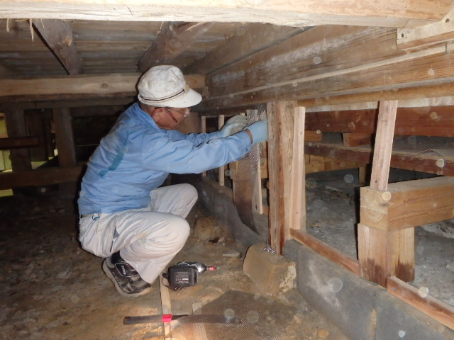 お客様はコウモリが入らないようにして欲しいご依頼です。天井や壁でのカサカサ音や糞や尿の臭い、外周や外壁へ糞を落とすなどの被害。