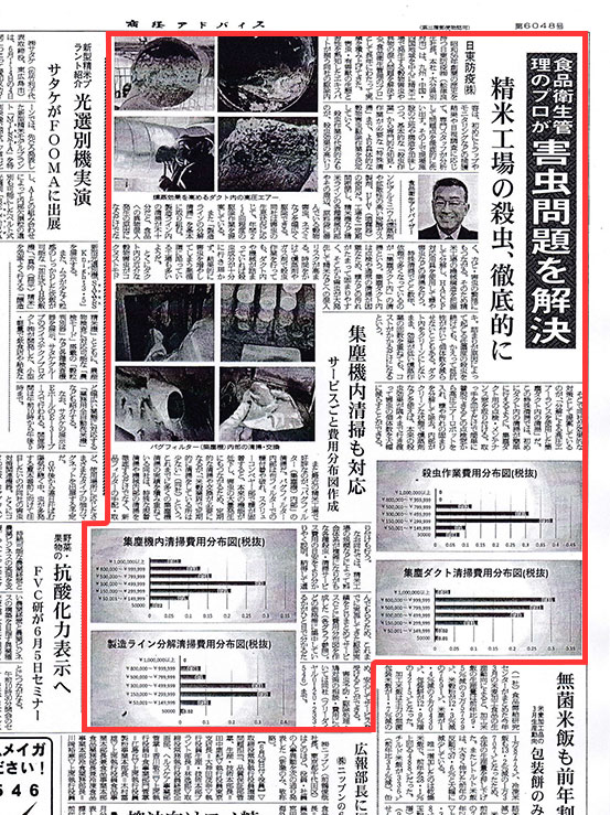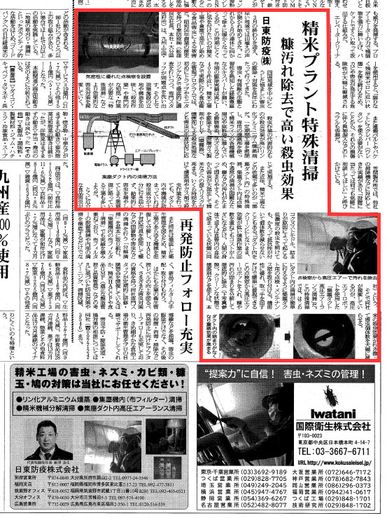 昭和56年創業の歴史を持つ日東防疫(株)(舩津 良生社長、本社・大分県別府市) は、九州・中国・ 四国地域を中心に精米エ場で発生する穀物害虫や異物の混入問題を解決する「食品衛生管理のプロ」として長年にわたって実績を積み上げてきた。