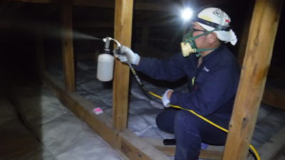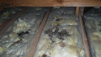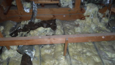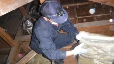 天井裏での糞清掃・断熱材回収・敷き直しを行いました。