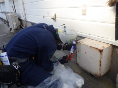 換気網と通気口の隙間をコーキングで塞ぐ作業があり