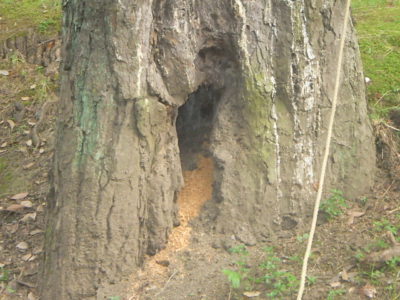 木の根元の隙間にいるスズメバチは、巣が何処に