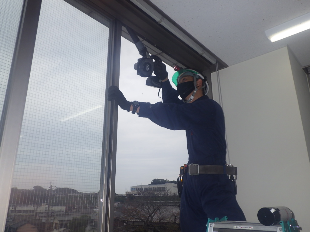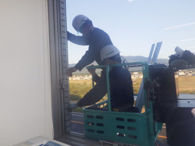窓枠に網を取り付けるためのアングルを高所作業車を
