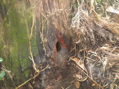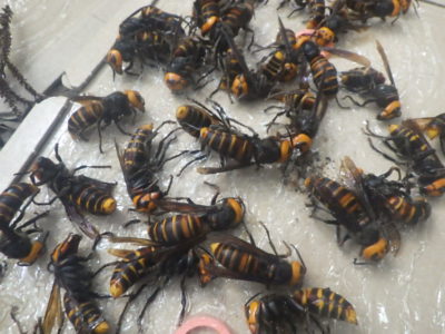 戻り蜂をとりながら薬剤を木の中に吹き付け、