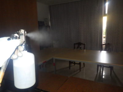 に薬剤散布をおこない、部屋には空間噴霧