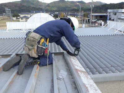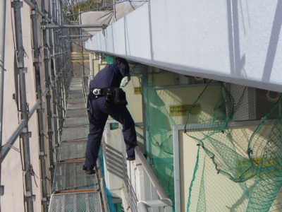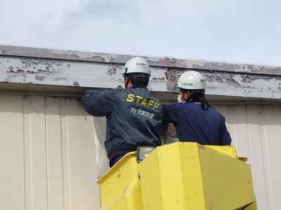 高所作業車を使用し、施工手順・閉塞施工等を指導し