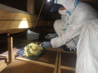 天井裏では排泄物の清掃、断熱材の回収・敷き直し