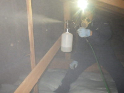 衛生害虫等に効く薬剤をミスト状にして噴霧する為、