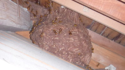 巣を見つけたら出来るだけ刺激せず、その場に近寄らず、早々に弊社のような専門業者を手配して、駆除を行う事をお勧めします。