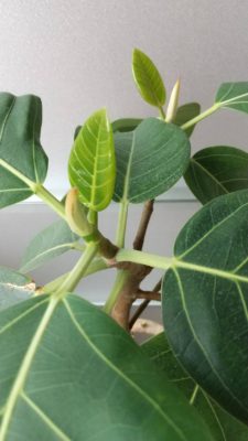 会社で育てているゴムの木から、ツヤツヤの新芽が出てきました(^^♪