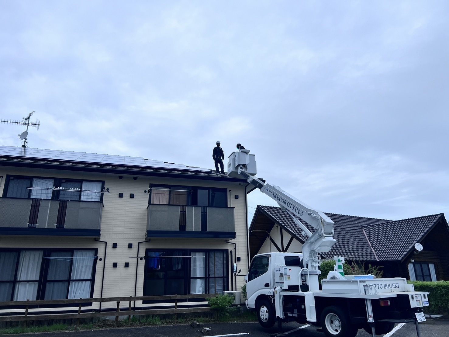 さて、先週は中津市のアパートの屋根にある太陽光パネルへのハト侵入防除施工に行ってまいりました。